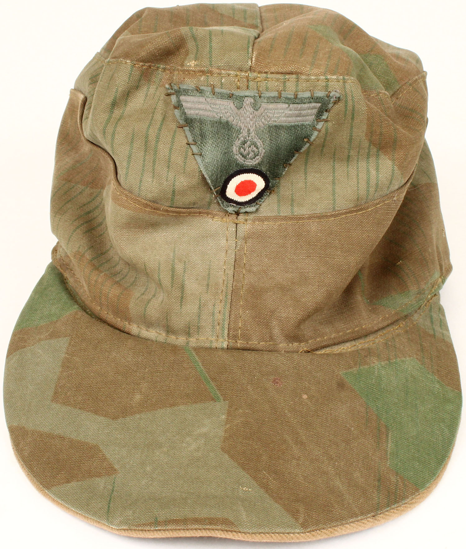 German, WW2 M43 SPLINTER camouflage M41 cap, the reason it doesn't have usable flaps is because it was custom made from Zeltbaun material. Very common especially among officers during the war, has a couple small stains & wear. Grade: Excellent - Value: 50 to 500