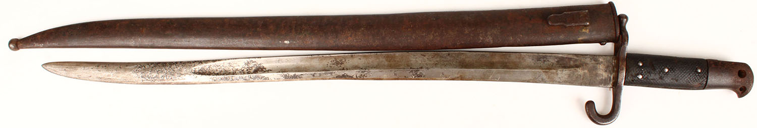 Austrian, M1867 Sword bayonet, Left side of blade is marked ''W'', right side of blade is marked, ''GF'', ''JUNG'', & stamped with a Austrian eagle, right side of guard is marked ''34.Z2.A'', blade has patina, comes with metal sheath, missing detachment button. Grade: Very Good - Value: 150 to 300