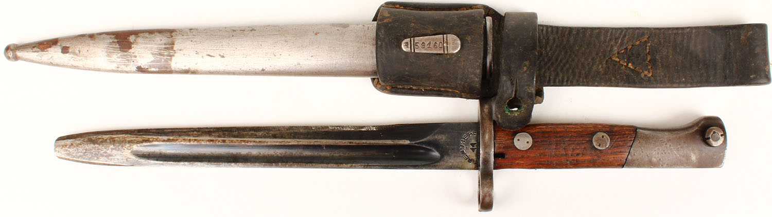 Yugoslavia, M1948 Bayonet, right side of blade is marked in Cyrillic that means ''PREDUZECE'' which translates to Factory, & ''44'', blade retains most of it bluing with areas of wear & brown patina, tip has been broken off, comes with sheath & frog. Grade: Very Good + - Value: 80 to 160