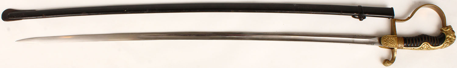 German, Lionheads saber, no markings on the blade, lions head with ruby eyes, crossed sword and spear on one side of guard, crest on the other side, blade has minor patina, comes with scabbard. Grade: Excellent - Value: 150 to 500