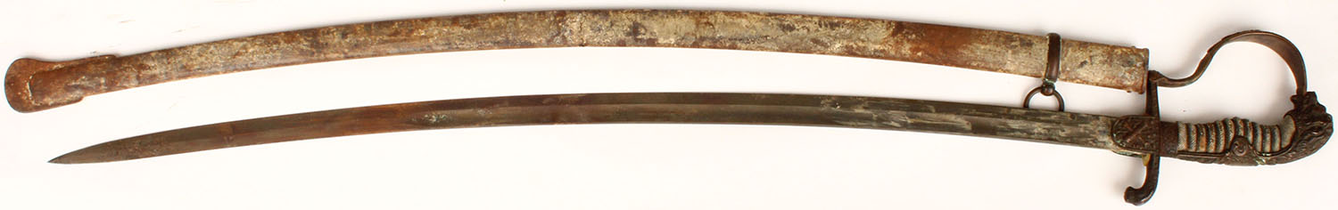 German, Lionheads saber, no markings on the blade, top of guard is marked ''GES GESCH'', lions head with ruby eyes, crossed cannons on one side of guard, blade has rust/corrosion & wear, guard & grip have heavy wear, comes with scabbard. Grade: Good + - Value: 50 to 200
