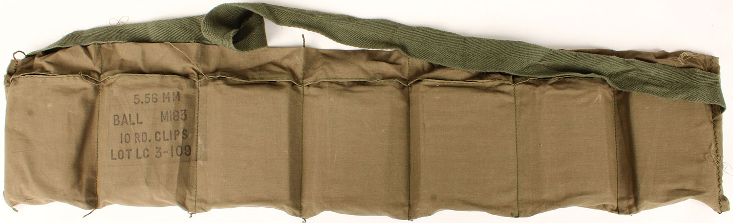 US, 7 pouch bandoleer, with 2 clips of 10 Rds. Of 5.56mm M193 Ball in each pouch, ammo is excellent, bandoleer is marked, ''5.56 MM'', ''BALL M193'', ''10 RD.CLIPS'', ''LOT LC 3-109''. Grade: Excellent ++ - Value: 50 to 100