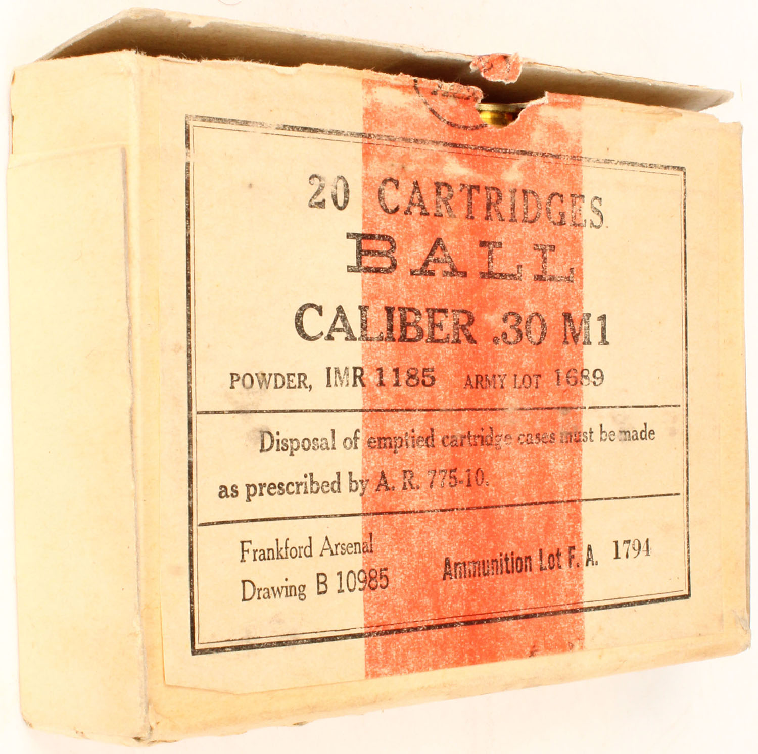 Frankford Arsenal, .30 M1 Ball, 1pc, Full, buff box with buff/red label & black print, box is solid with rub marks, edge wear, pen/pencil marks, & light wear on bottom from bullets, ammo ranges from excellent to very good. Grade: Very Good + - Value: 20 to 40