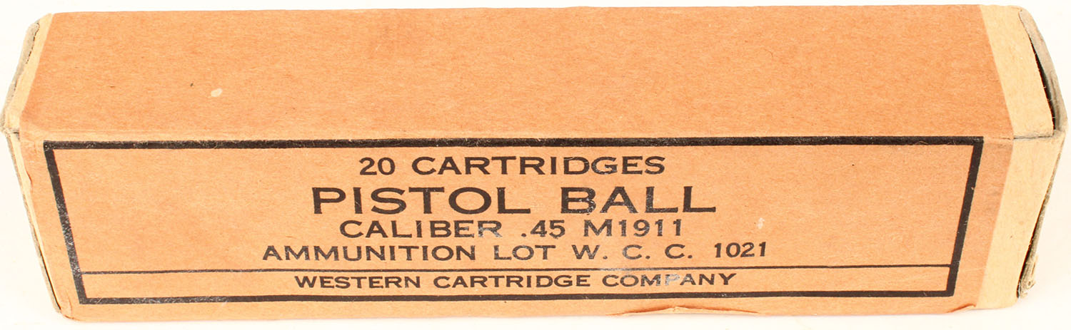 Western, .45 M1911 Pistol Ball, Lot W.C.C. 1021, 1pc, FULL & SEALED, buff box with brown label & black print, box is solid with light wear. Grade: Excellent ++ - Value: 10 to 30