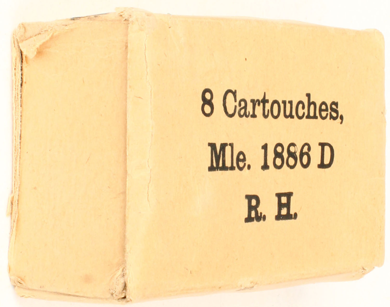 Remington, 8mm Lebel, Mle 1886D, Primed cases, cases dated April 1917, 1pc, Full, buff box with black print, box is solid with handling wear & light rub wear, cases are excellent. These cases were made by Remington at the old Robin Hood Arms factory. (61) Grade: Excellent - Value: 10 to 100