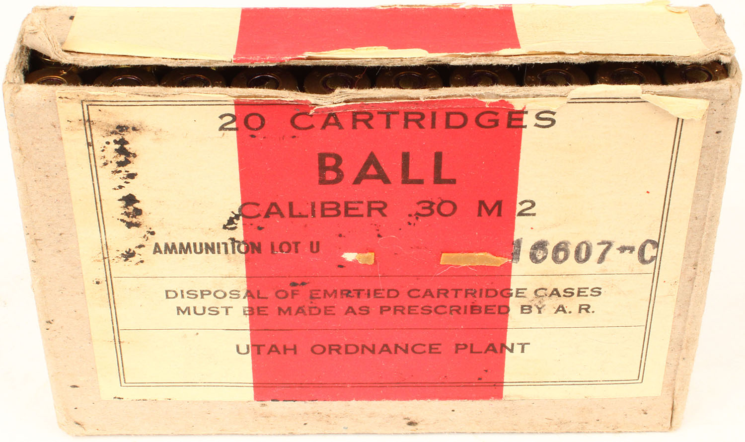 Utah Ordnance Plant, .30 M2 Ball, Lot U 16607-C, 1pc, Full, buff box with buff/red label & black print, box is solid with stains, rub marks, & edge wear, ammo is very good. Grade: Very Good ++ - Value: 20 to 60