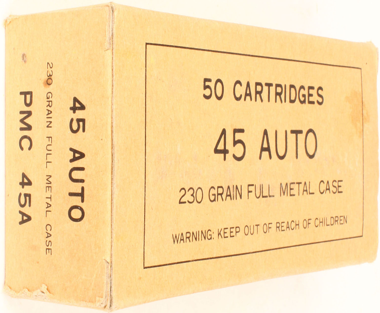 PMC, .45 Auto, 230 Gr. Full Metal Case, 1pc, Full, buff box with black print, box is solid with light rub marks & light edge wear, ammo is excellent. Grade: Excellent + - Value: 30 to 60