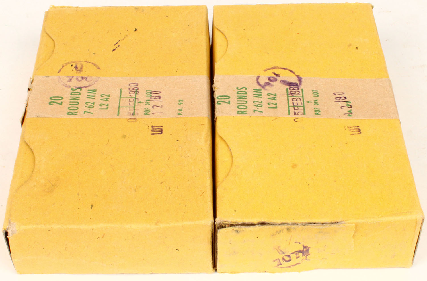 Lot of two, POF (Pakistan Ordnance Factories), 7.62mm L2 A2, 1980 dated, 1pc, Both Full, yellow box with buff label & green print, box's are solid with light rub wear, ammo is very good. Grade: Excellent - Value: 30 to 60