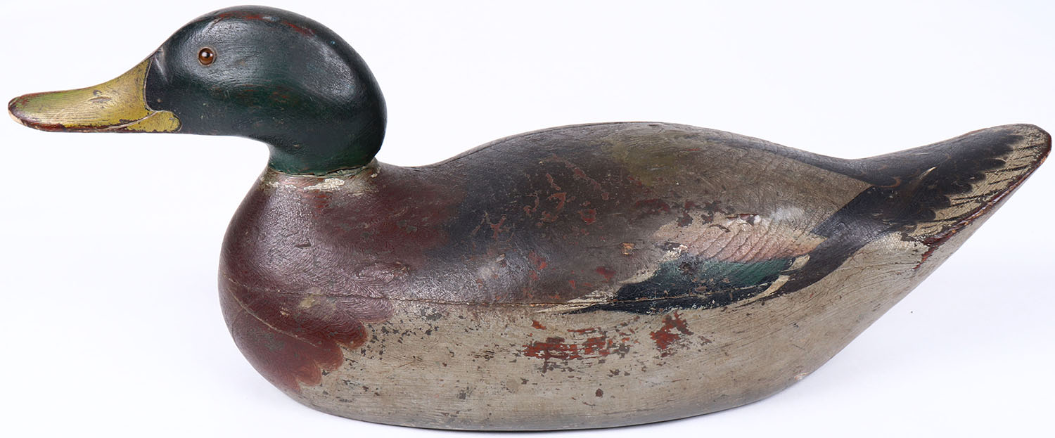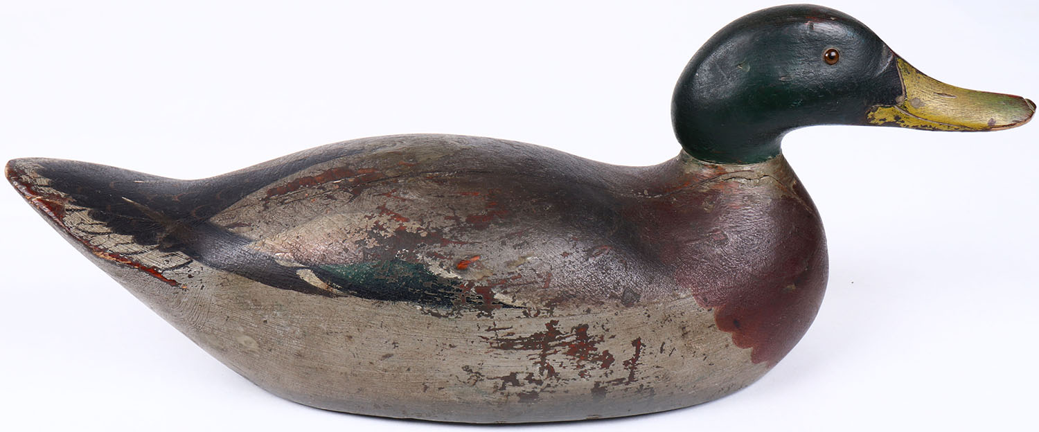 Mallard Drake, by Mason Decoy Company, Detroit, MI,1896-1924 premier grade, glass eyes, solid wood, original paint, head is slightly loose, has hairline crack on back. Grade: Excellent - Value: 500 to 1000