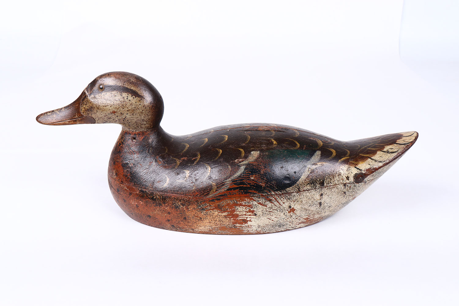 Mallard Hen, by Mason Decoy Company, Detroit, MI,1896-1924 premier grade, glass eyes, hollow wood, original paint, has age crack on back. Grade: Excellent - Value: 500 to 1000