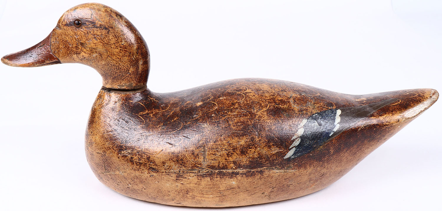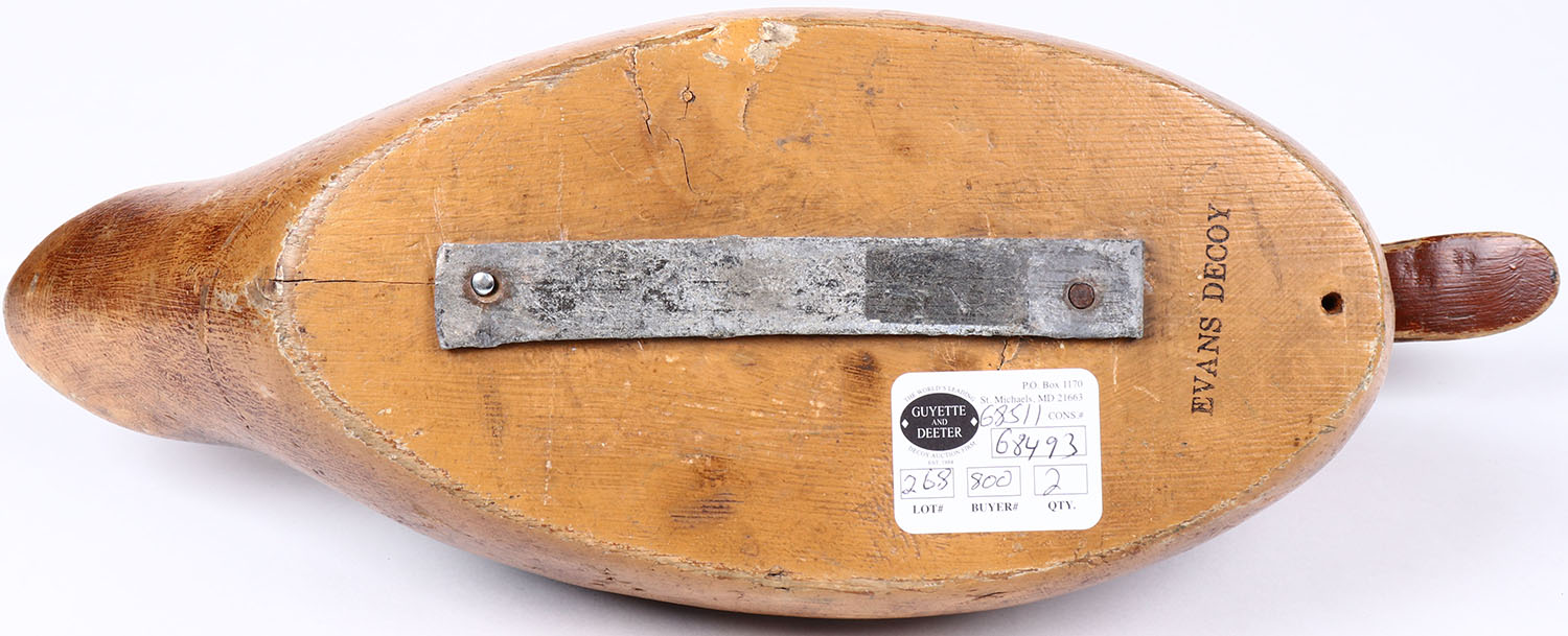 Mallard Hen, by Evans Decoy, glass eyes, solid wood, original paint, neck putty is missing, stamped on bottom. Grade: Excellent - Value: 100 to 1000
