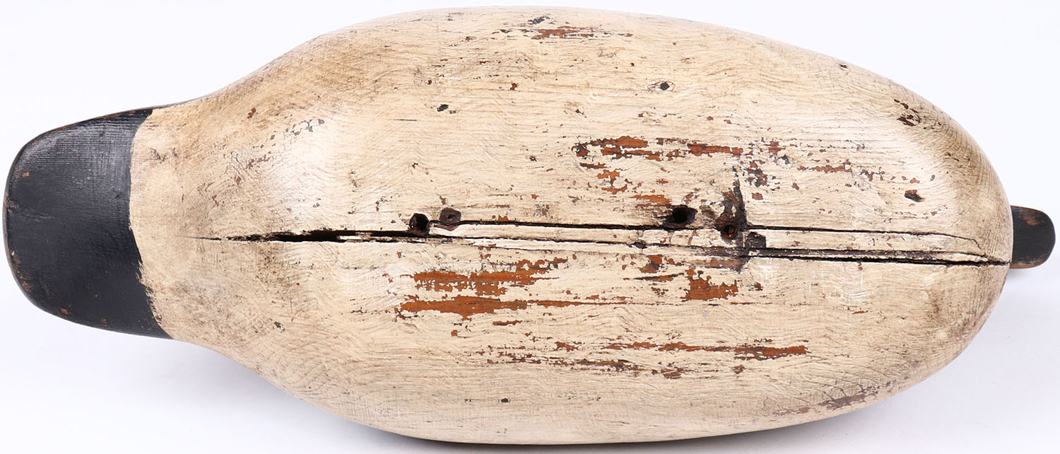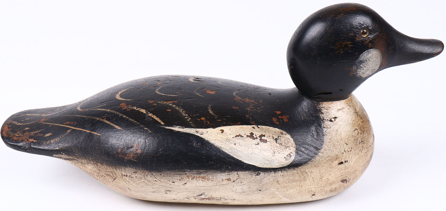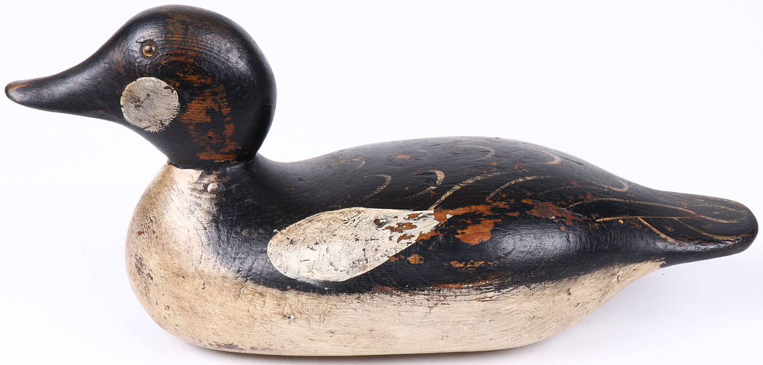 Goldeneye Drake by Mason Decoy Company, Detroit, MI,1896-1924 standard grade, glass eyes, solid wood, original paint with typical wear/ perhaps areas of touch-up, has age cracks on bottom. Grade: Excellent - Value: 50 to 100