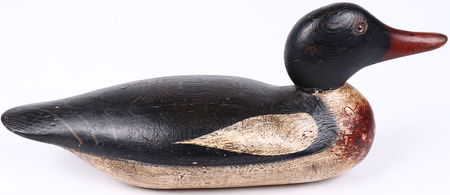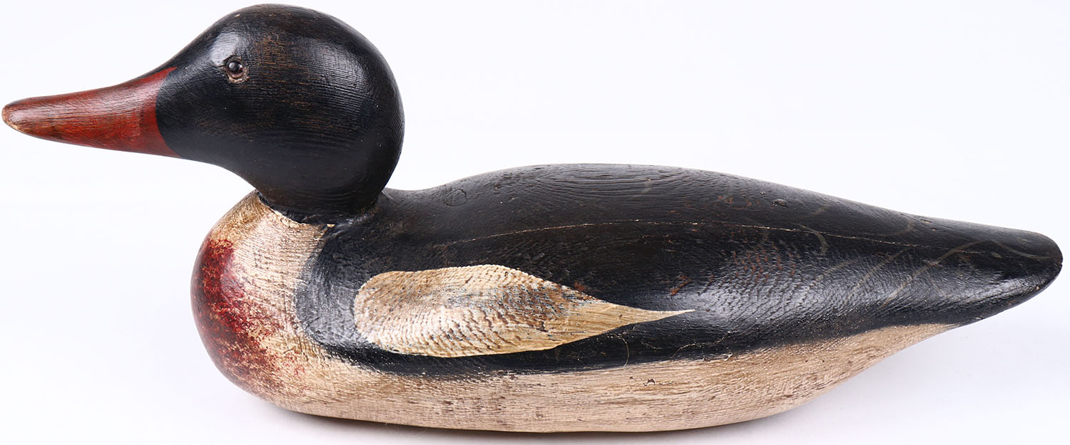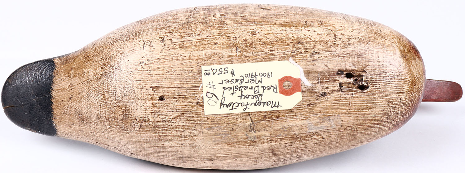 Red Breasted Merganser by Mason Decoy Company, Detroit, MI,1896-1924 standard grade, glass eyes, solid wood, original paint, structurally excellent. Grade: Excellent - Value: 150 to 300