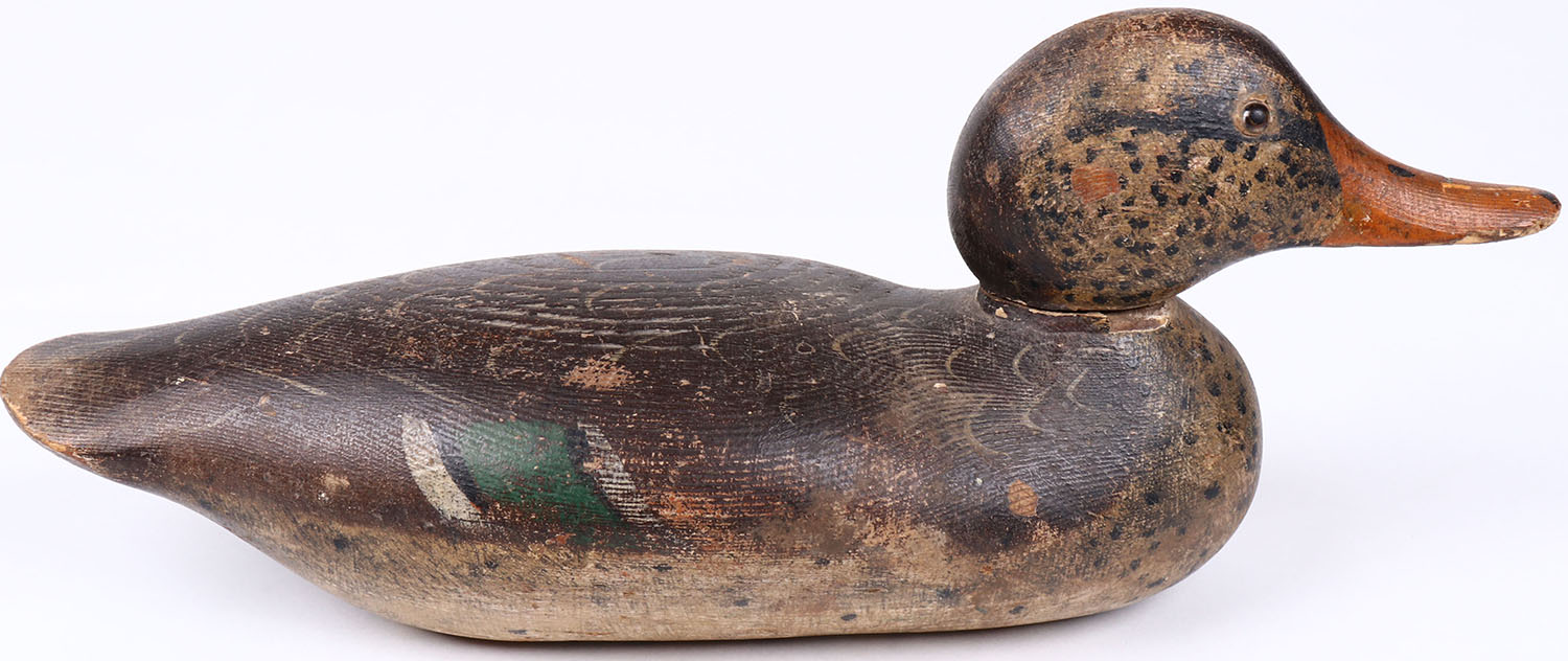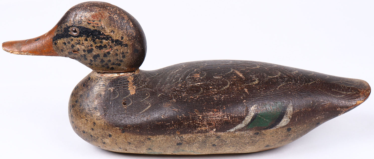 Mallard Hen by Mason Decoy Company, Detroit, MI,1896-1924 standard grade, glass eyes, solid wood, original paint, head is loose. Grade: Excellent - Value: 100 to 200