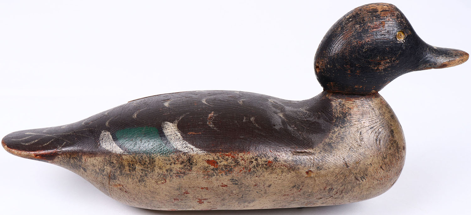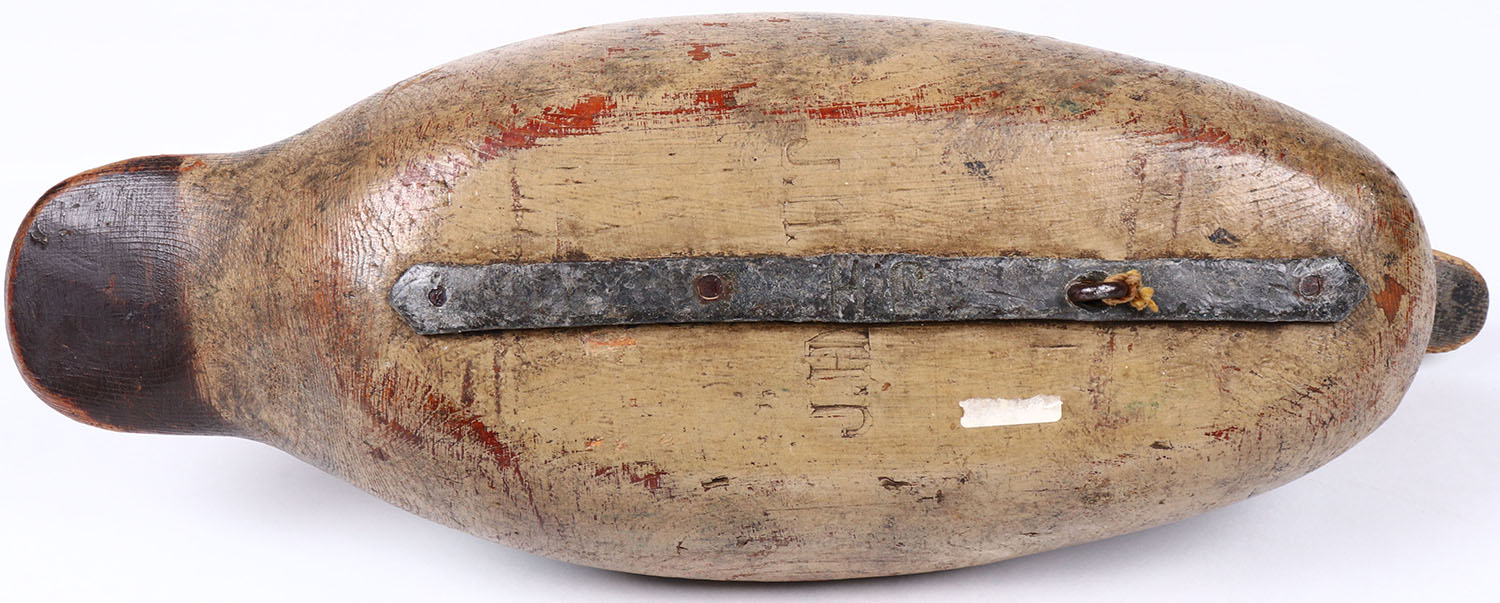 Mallard Body / Head Unknown Species by Mason Decoy Company or Hays Decoy Factory, Detroit, MI,1896-1924 standard grade, no eyes, solid wood, has age cracks on back and under neck, original paint, branded JH on bottom. Grade: Excellent - Value: 50 to 200