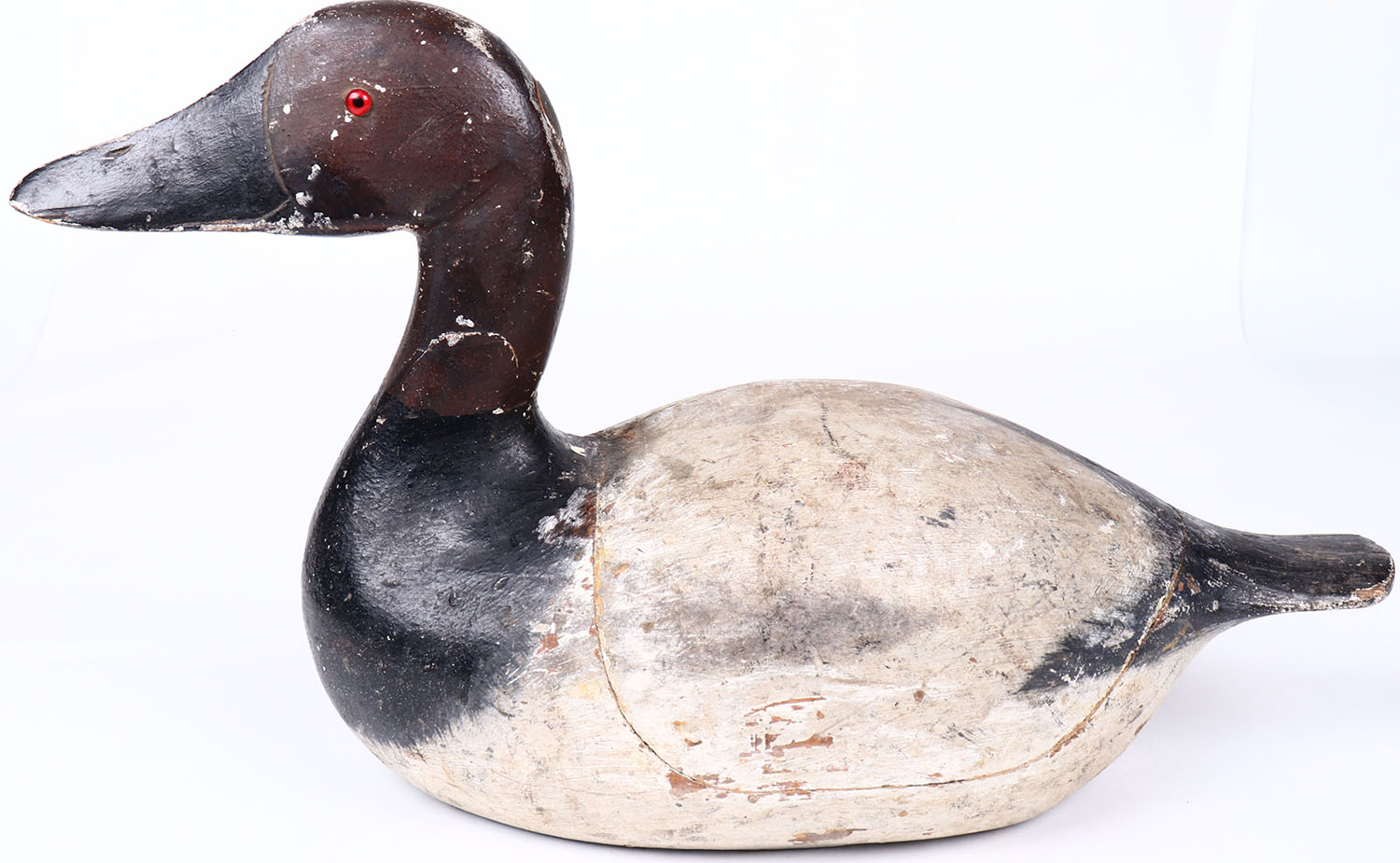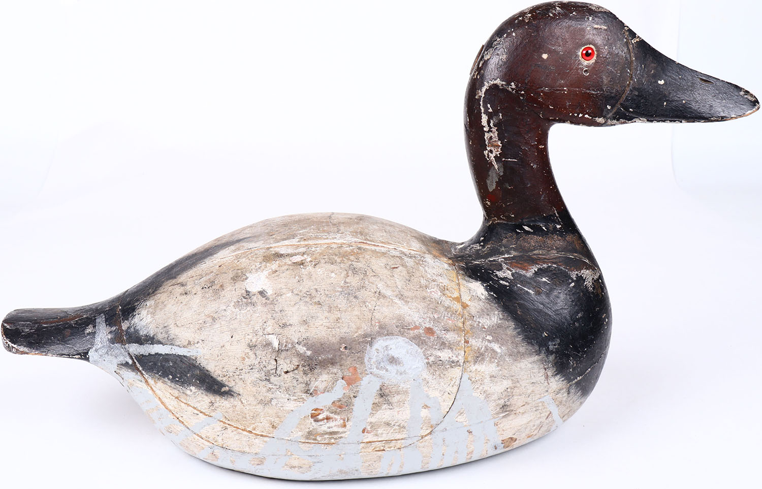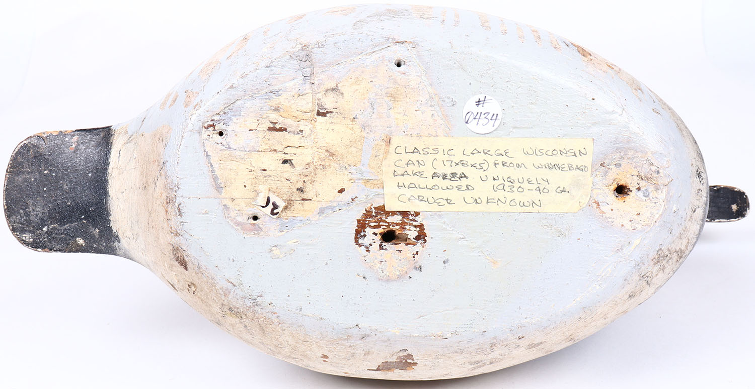 Canvasback Drake by unknown maker, Winnebago Lake Area, WI, glass eyes, hollow wood, original paint with typical wear and paint splashes, structurally excellent. Grade: Excellent - Value: 50 to 150