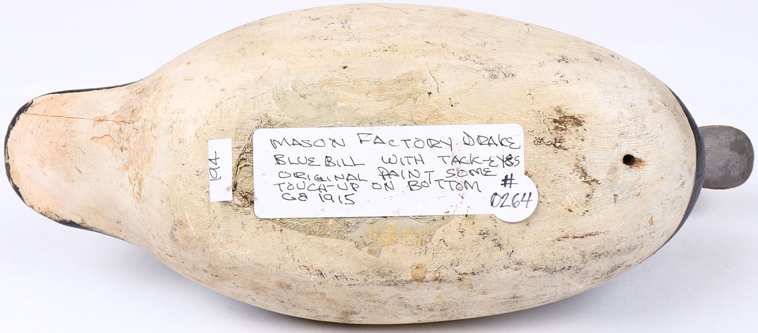Bluebill Drake by Mason Decoy Company, Detroit, MI,1896-1924, standard grade, tack eyes, original paint with some touch up on bottom, structurally excellent. Grade: Excellent - Value: 50 to 150