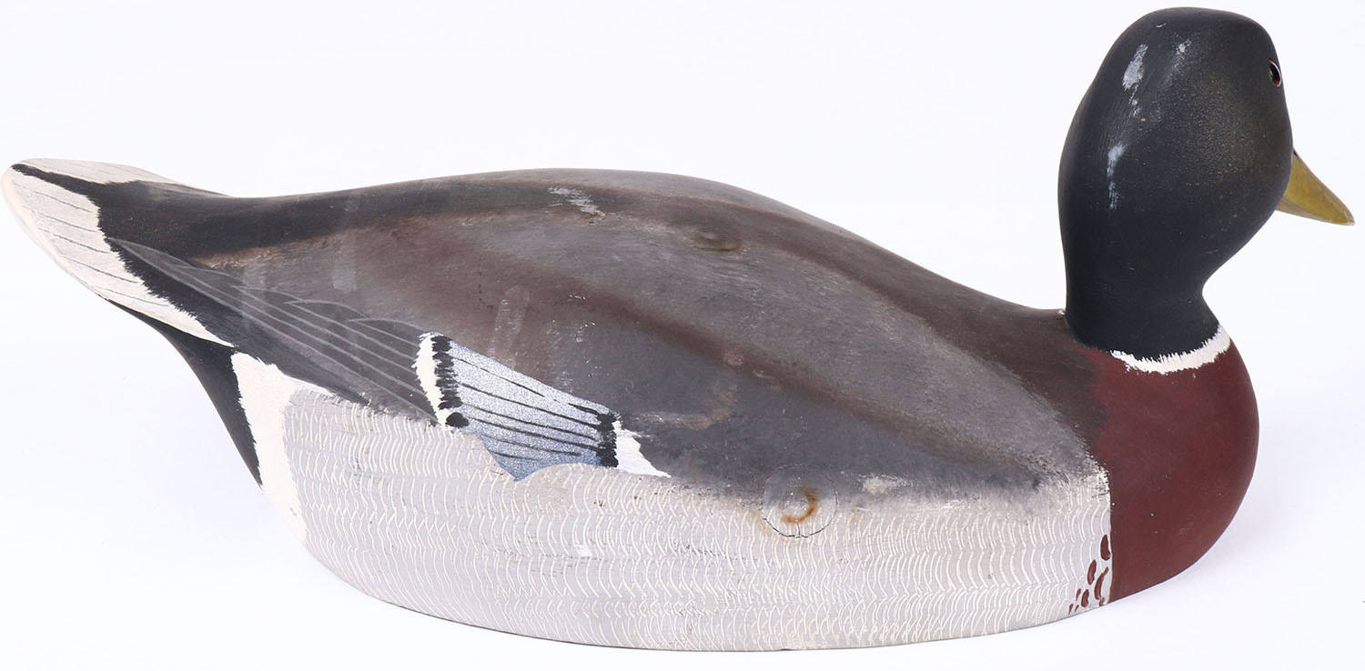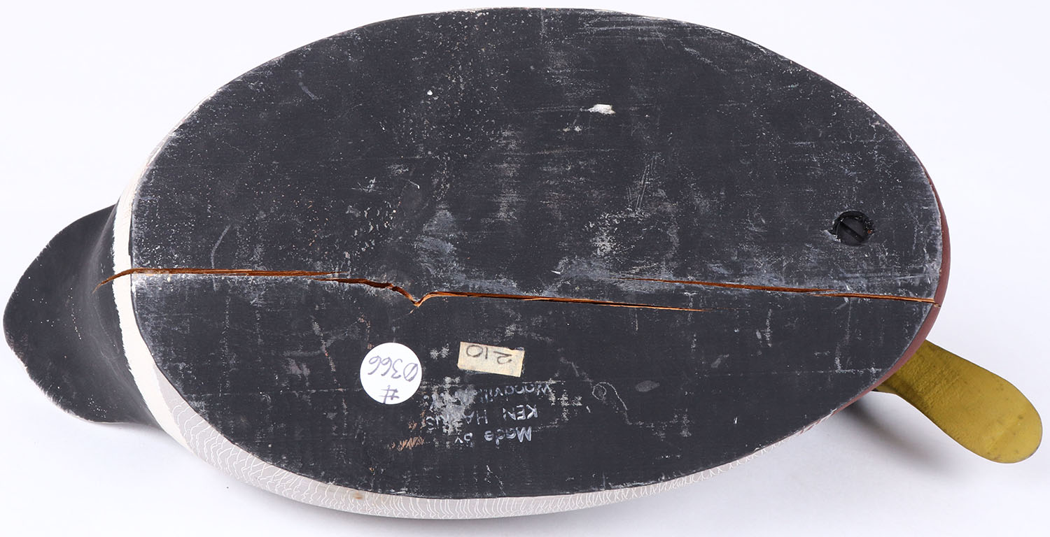 Mallard Drake by Ken Harris, Woodville, N.Y. glass eyes, solid wood, has age cracks on bottom, original paint with comb painting. Grade: Excellent + - Value: 50 to 100
