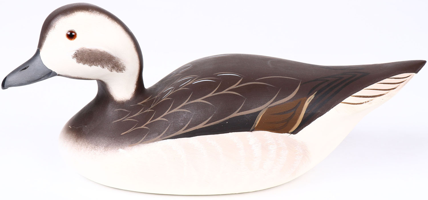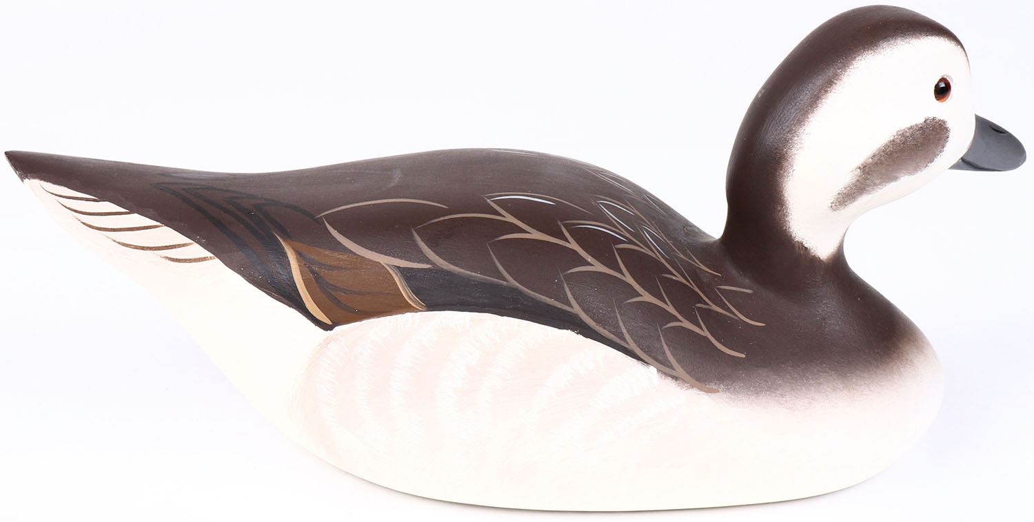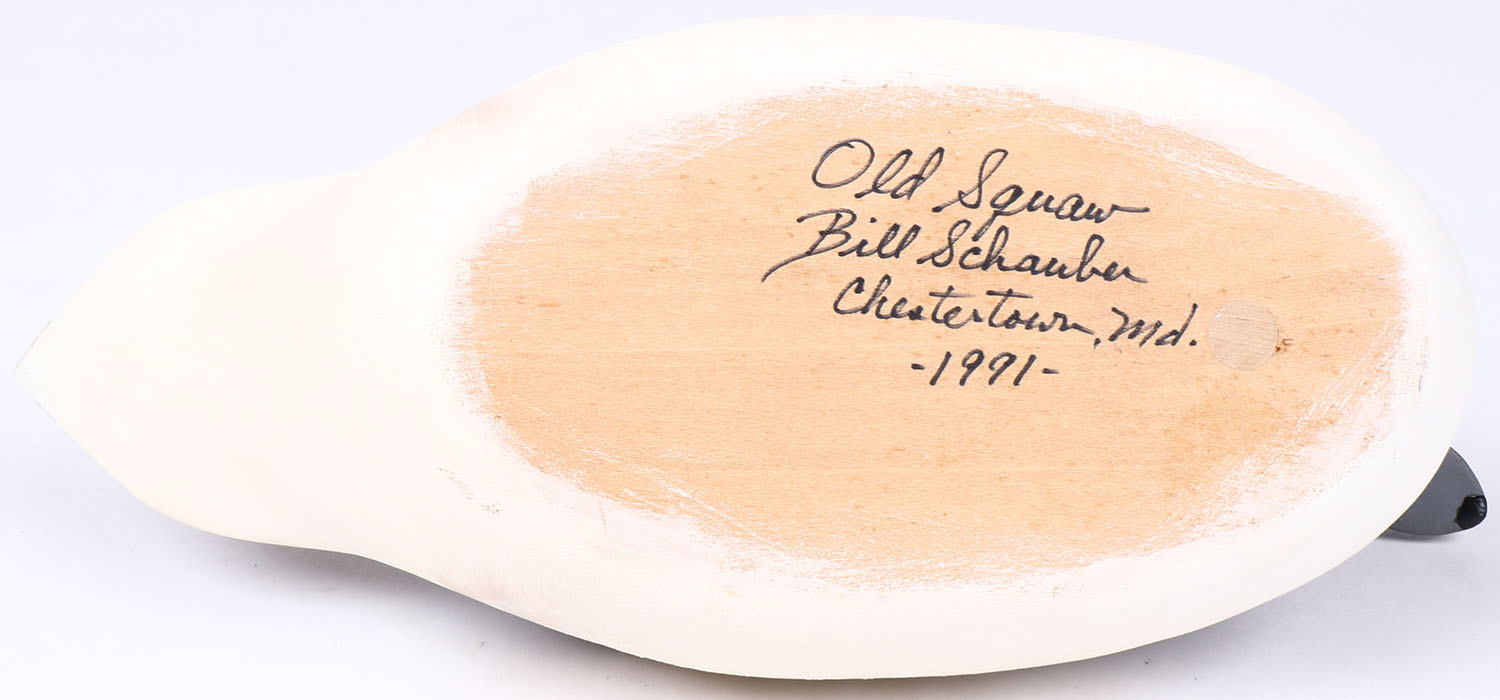 Old Squaw Drake by Bill Schauber (1991), Chestertown, MD, glass eyes, solid wood, signed on bottom, structurally excellent, original paint with beautiful feather detail. Grade: MINT - Value: 50 to 100