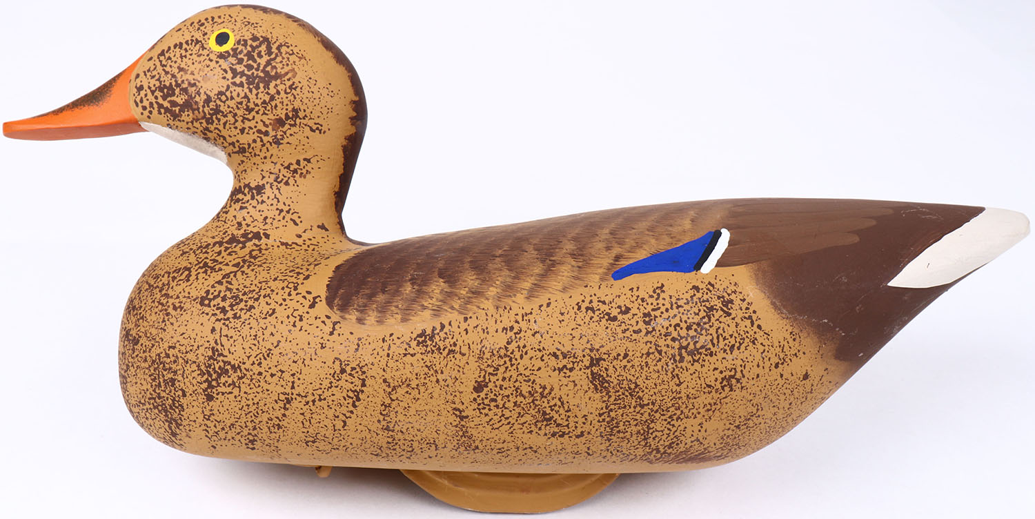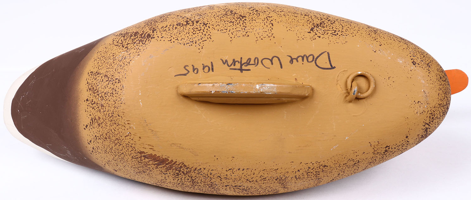 Mallard Hen by Dave Wooten, painted eyes, solid wood, repainted, signed on bottom, structurally excellent. Grade: MNT - Value: 30 to 60