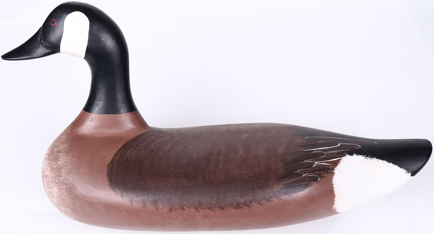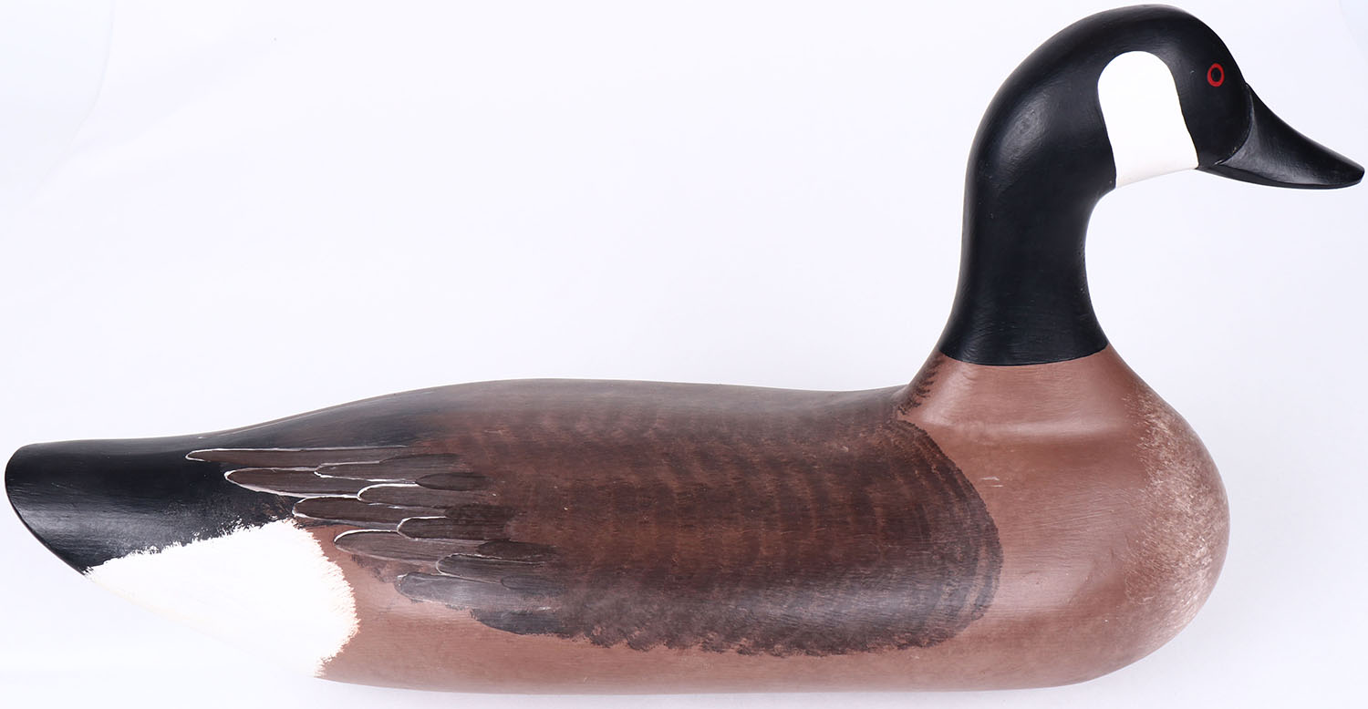 Canada Goose by George Hendricks, painted eyes, solid wood, original paint, signed on bottom, structurally excellent. Grade: MINT - Value: 100 to 200