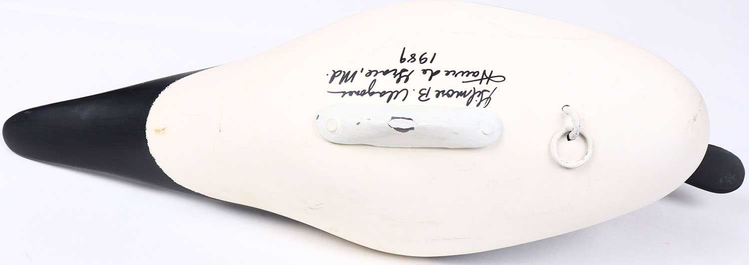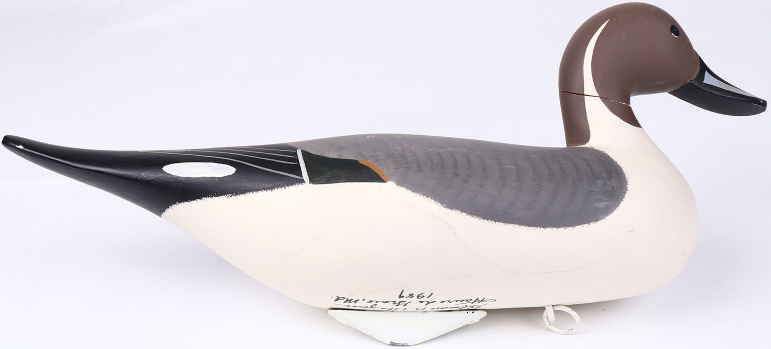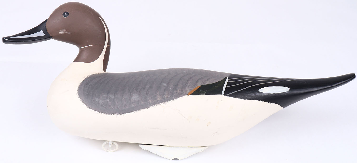 Pintail Drake by Hidmore B. Wagoner, Havre De Grace, MD, painted eyes, solid wood, original paint, has hairline age crack around neck. Grade: Very Good + - Value: 50 to 100