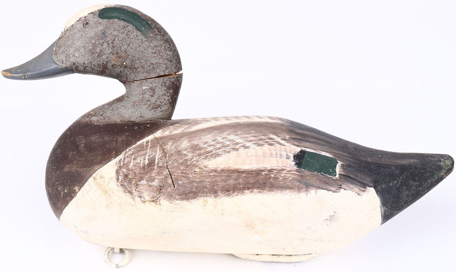 Widgeon Drake by unknown maker, painted eyes, solid wood, original paint, has hairline age crack around neck. Grade: Very Good ++ - Value: 40 to 80