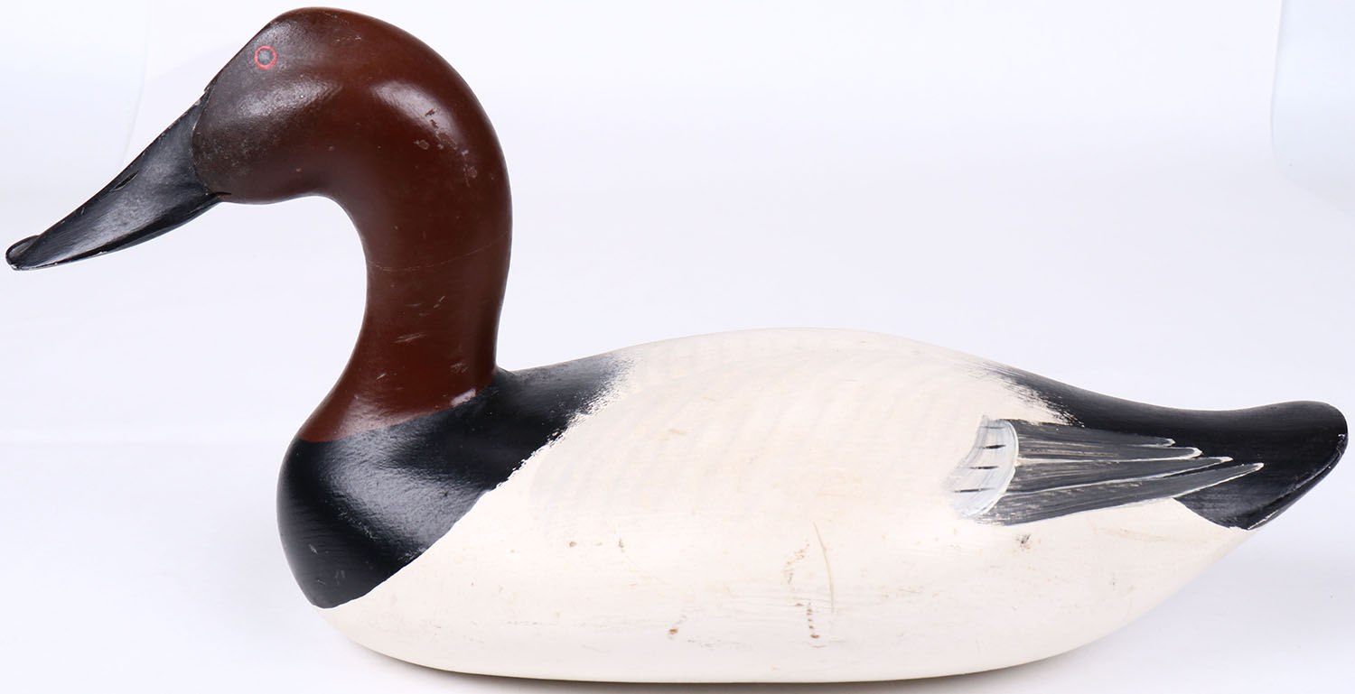 Canvasback Drake by John H Clark, (1985), Havre de Grace, MD, painted eyes, solid wood, structurally excellent, signed on bottom, original paint. Grade: Excellent - Value: 40 to 80