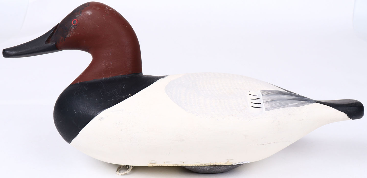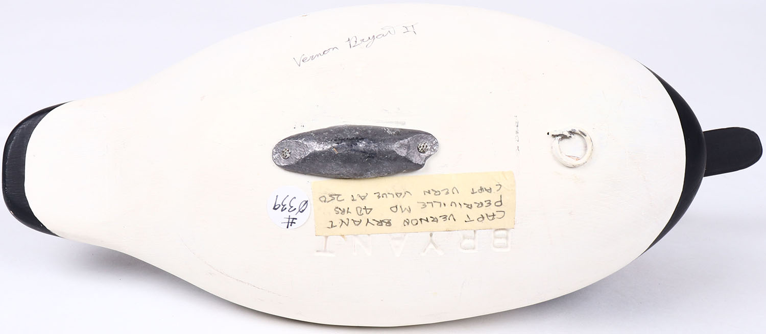 Canvasback Drake by Capt Vernon Bryant, Perriville MD, painted eyes, solid wood, structurally excellent, original paint, branded BRYANT and signed on bottom. Grade: MINT - Value: 50 to 100