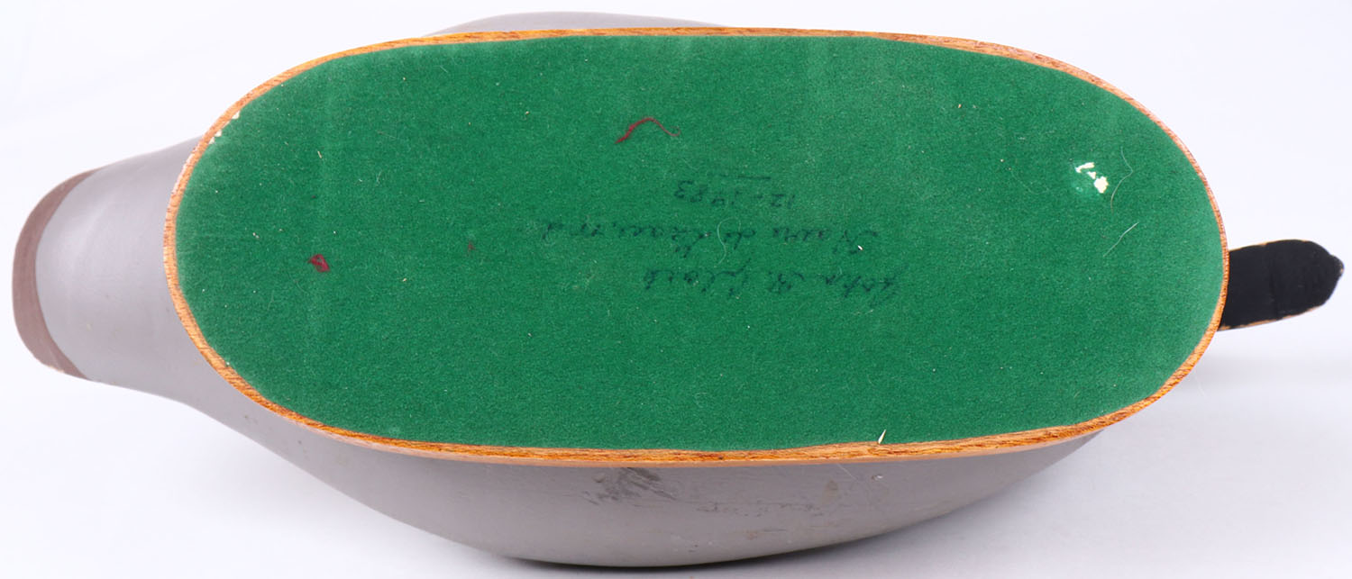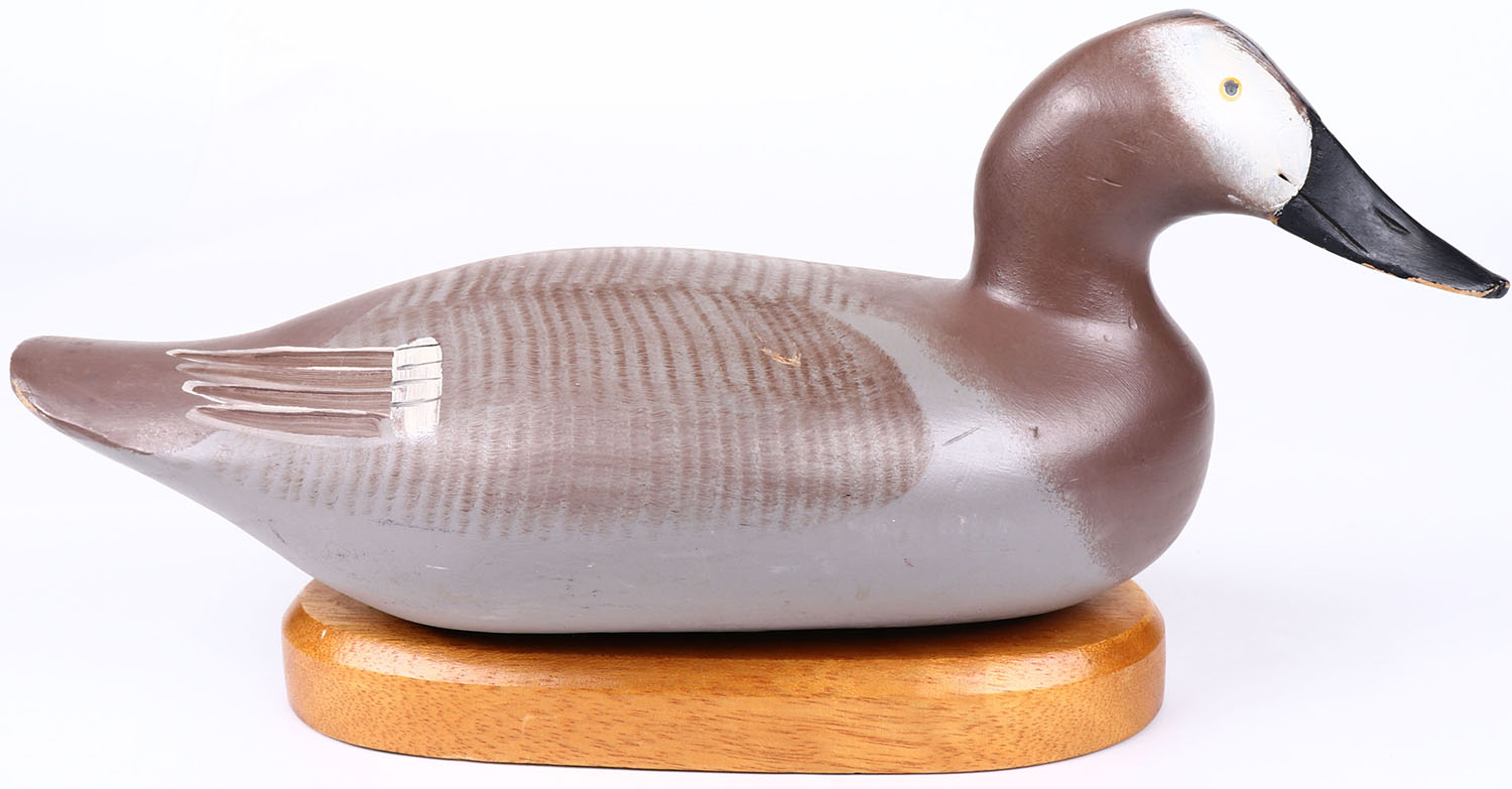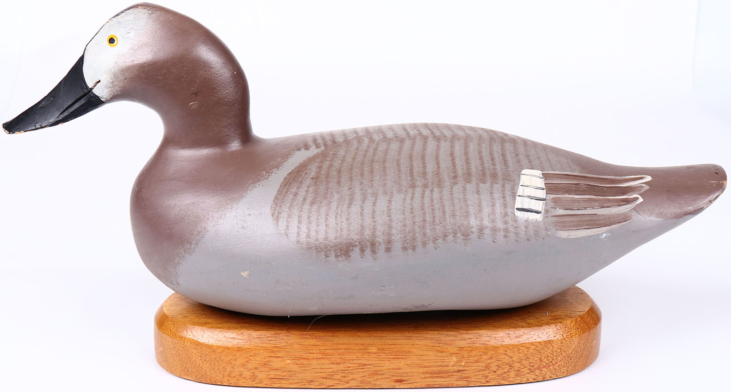Canvasback Hen on wood base by John H. Clark, Havre De Grace, MD, painted eyes, solid wood, structurally excellent, original paint. Grade: Excellent + - Value: 50 to 100