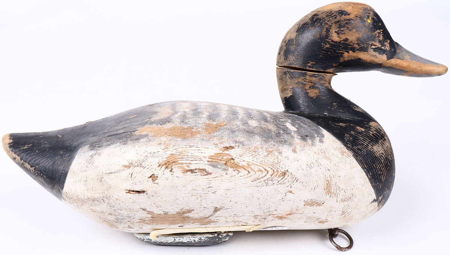 Bluebill Drake by unknown maker, MD, painted eyes, solid wood, has hairline age crack around neck, original paint with typical wear. Grade: Very Good ++ - Value: 30 to 60