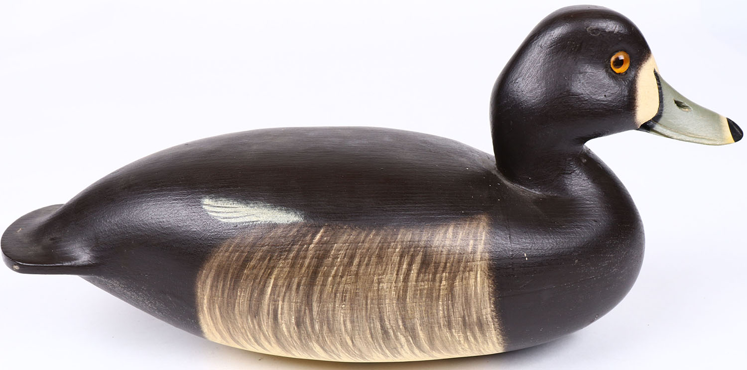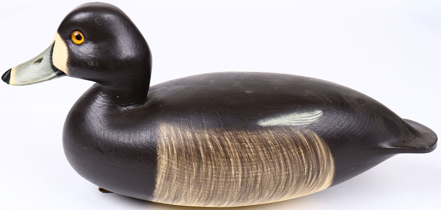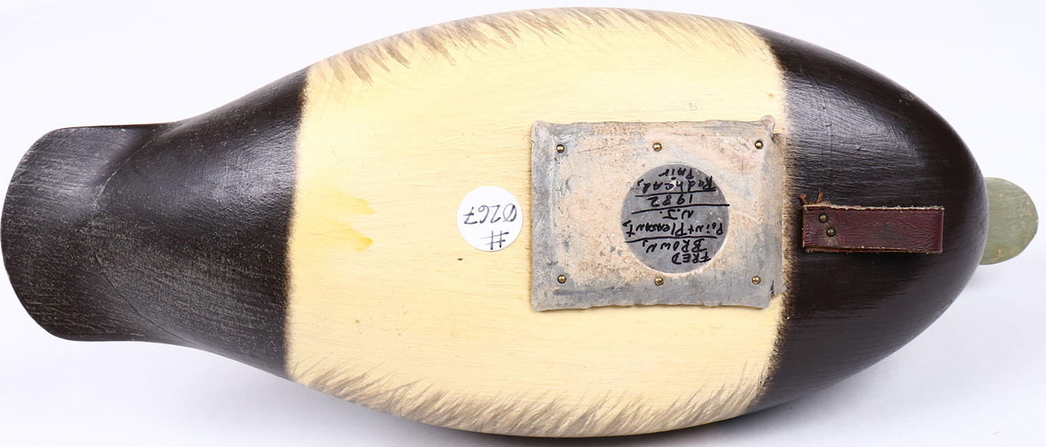 Ring-neck Drake by Fred Brown, Point Pleasant N.J, glass eyes, hollow wood, structurally excellent, signed on bottom, original paint. Grade: MINT - Value: 100 to 200