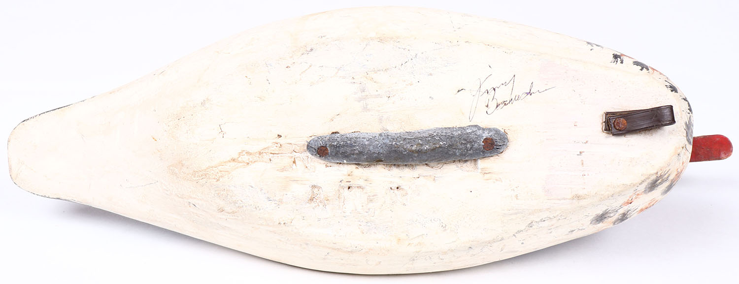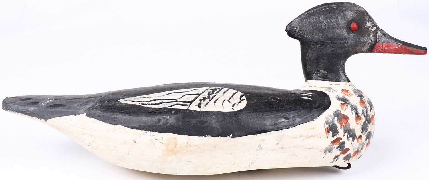 Red Breasted Merganser by Jerry B ??, tack eyes, solid wood, original paint, structurally excellent, signed on bottom. Grade: Excellent - Value: 30 to 60