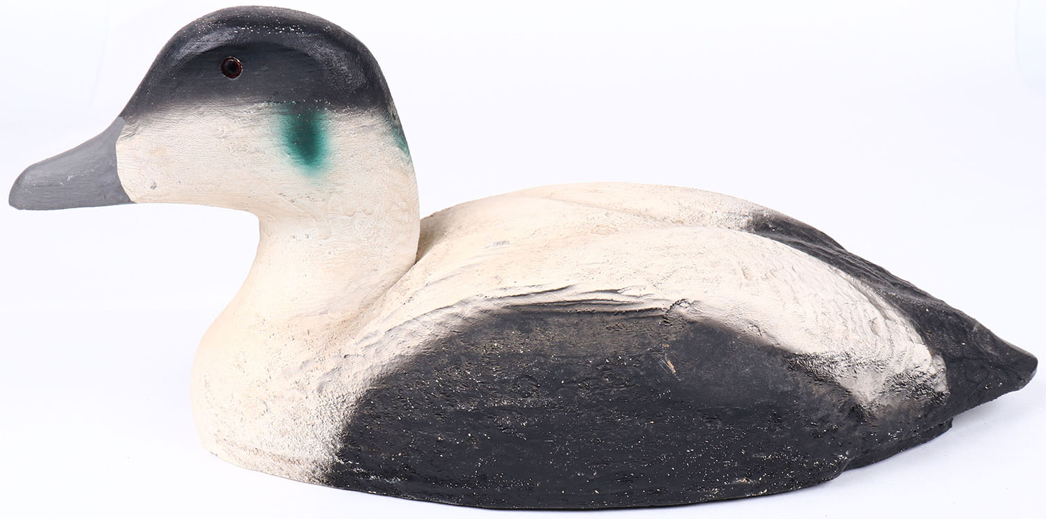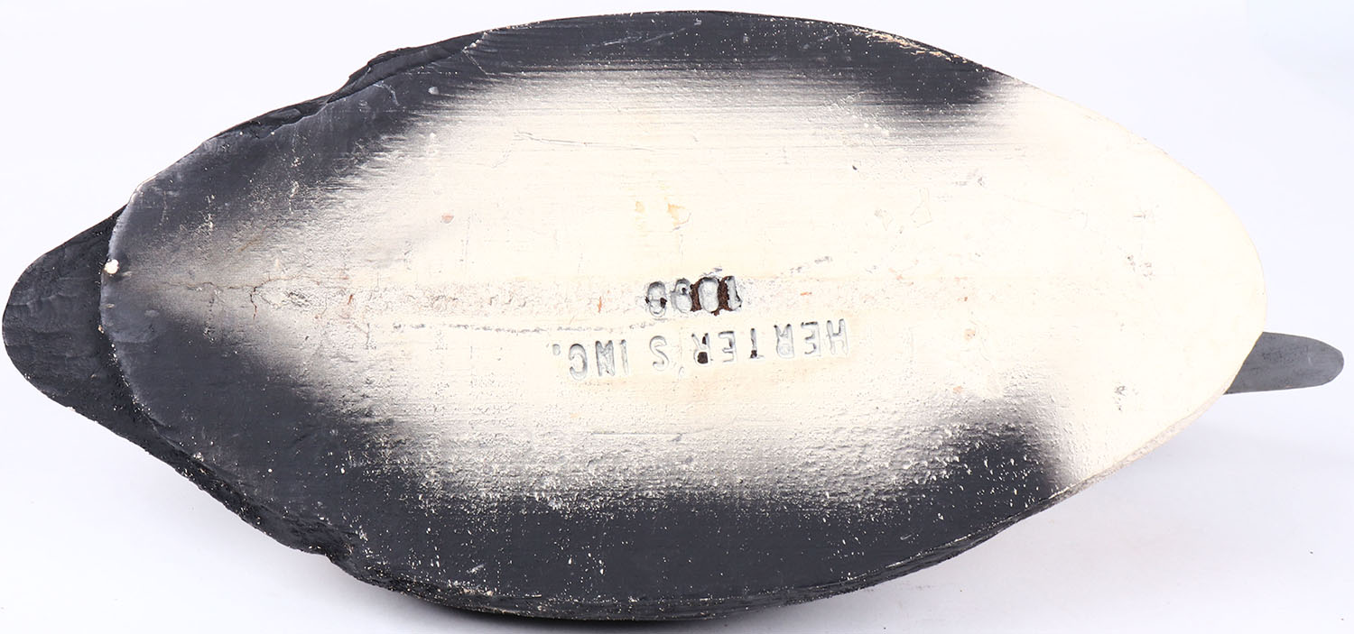 Eider by Herter's Inc, glass eyes, hollow wood, original paint, structurally excellent, branded HERTER'S INC. on bottom. Grade: MINT - Value: 40 to 80