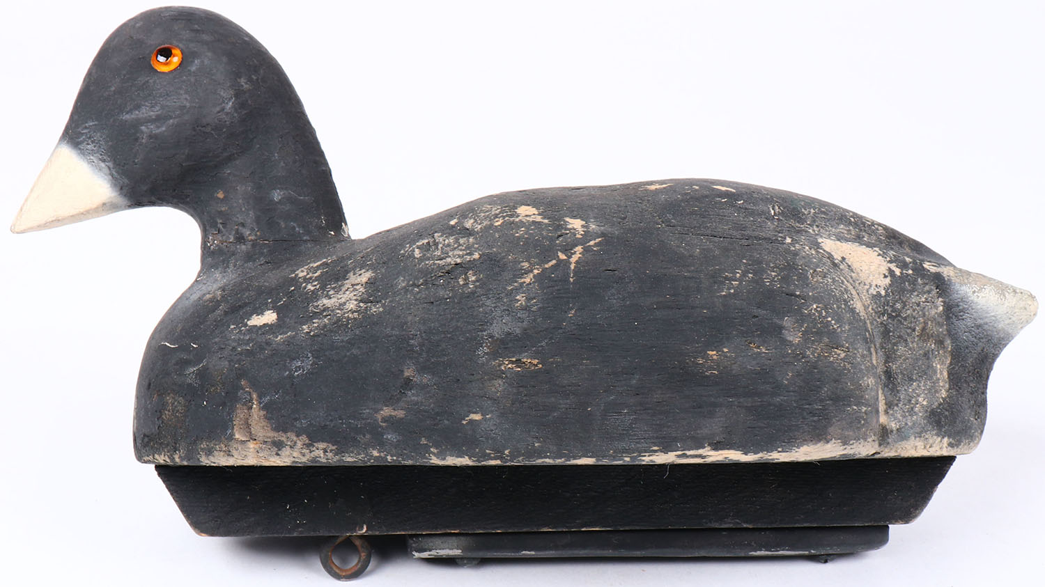 Coot by Herter's Inc. glass eyes, hollow wood, original paint with typical wear, structurally excellent. Grade: Excellent - Value: 30 to 60