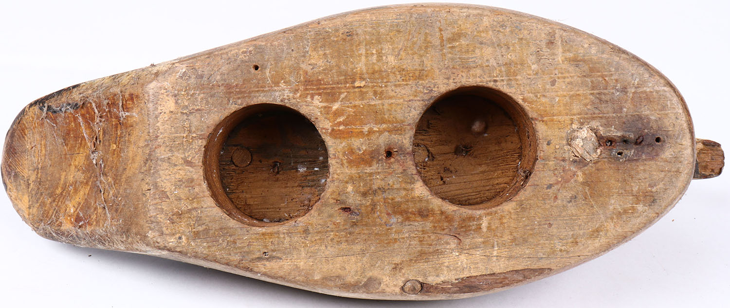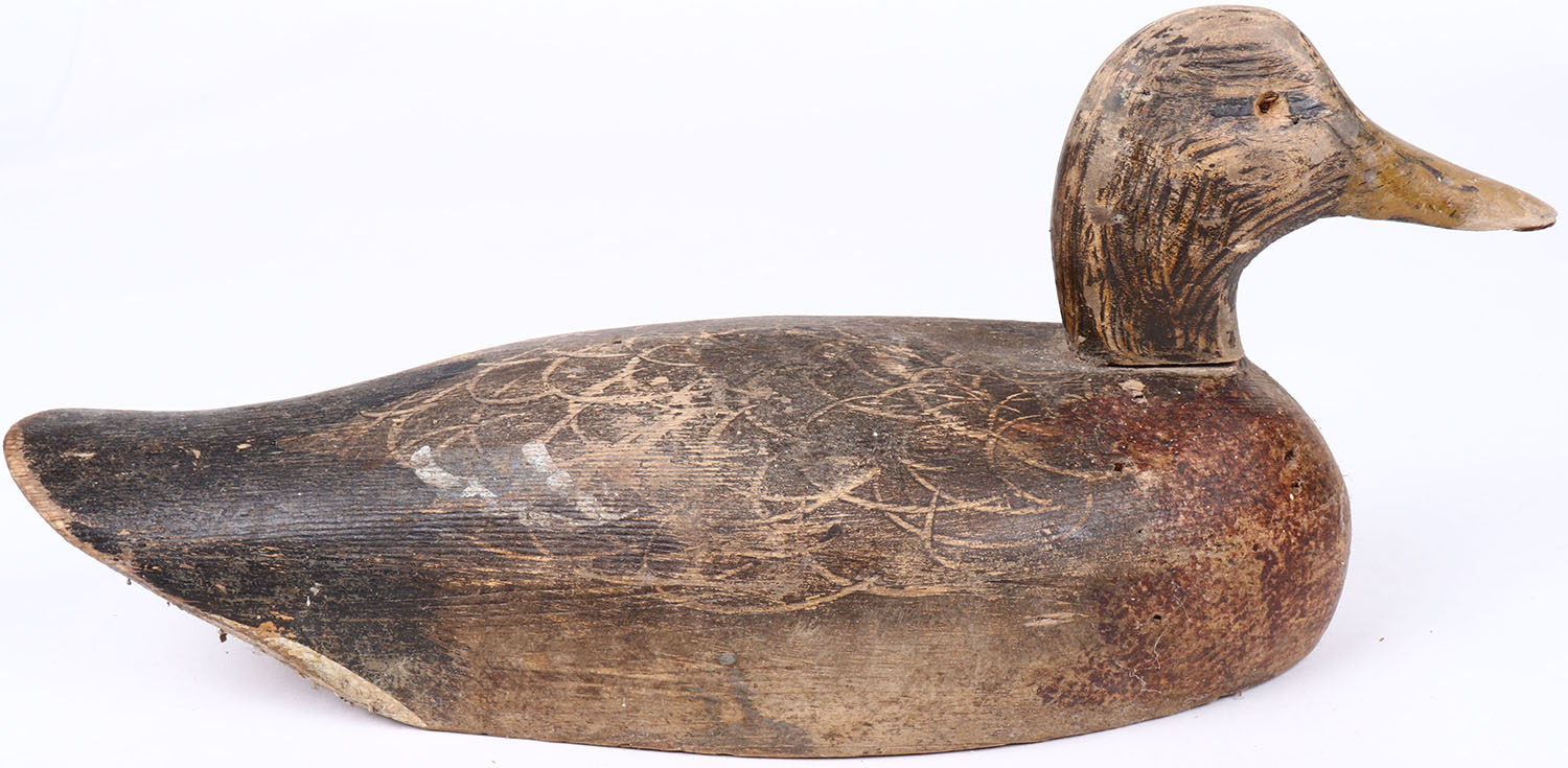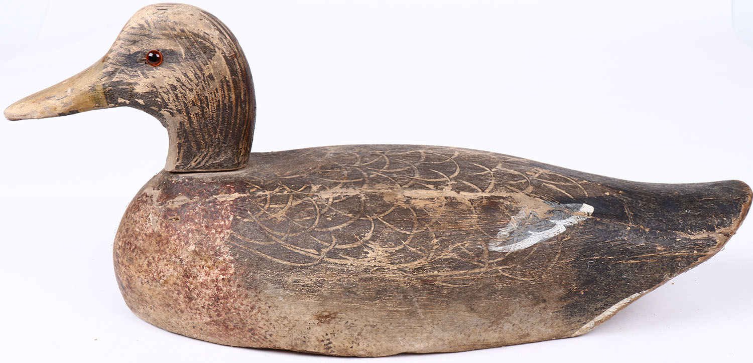 Black Duck by unknown factory, hollow wood, bill has a chip underneath, glass eyes, has hairline age cracks. Grade: Excellent - Value: 30 to 40