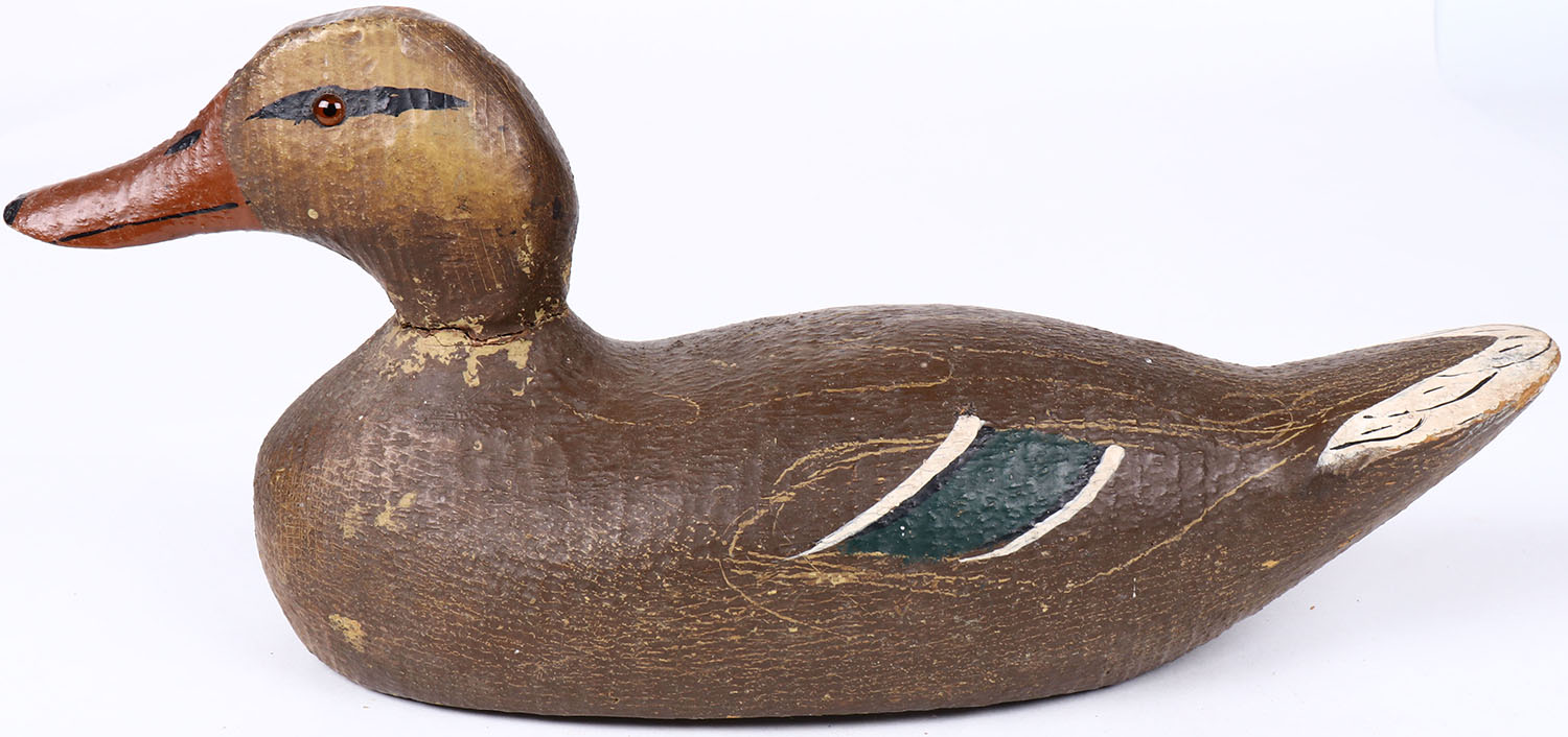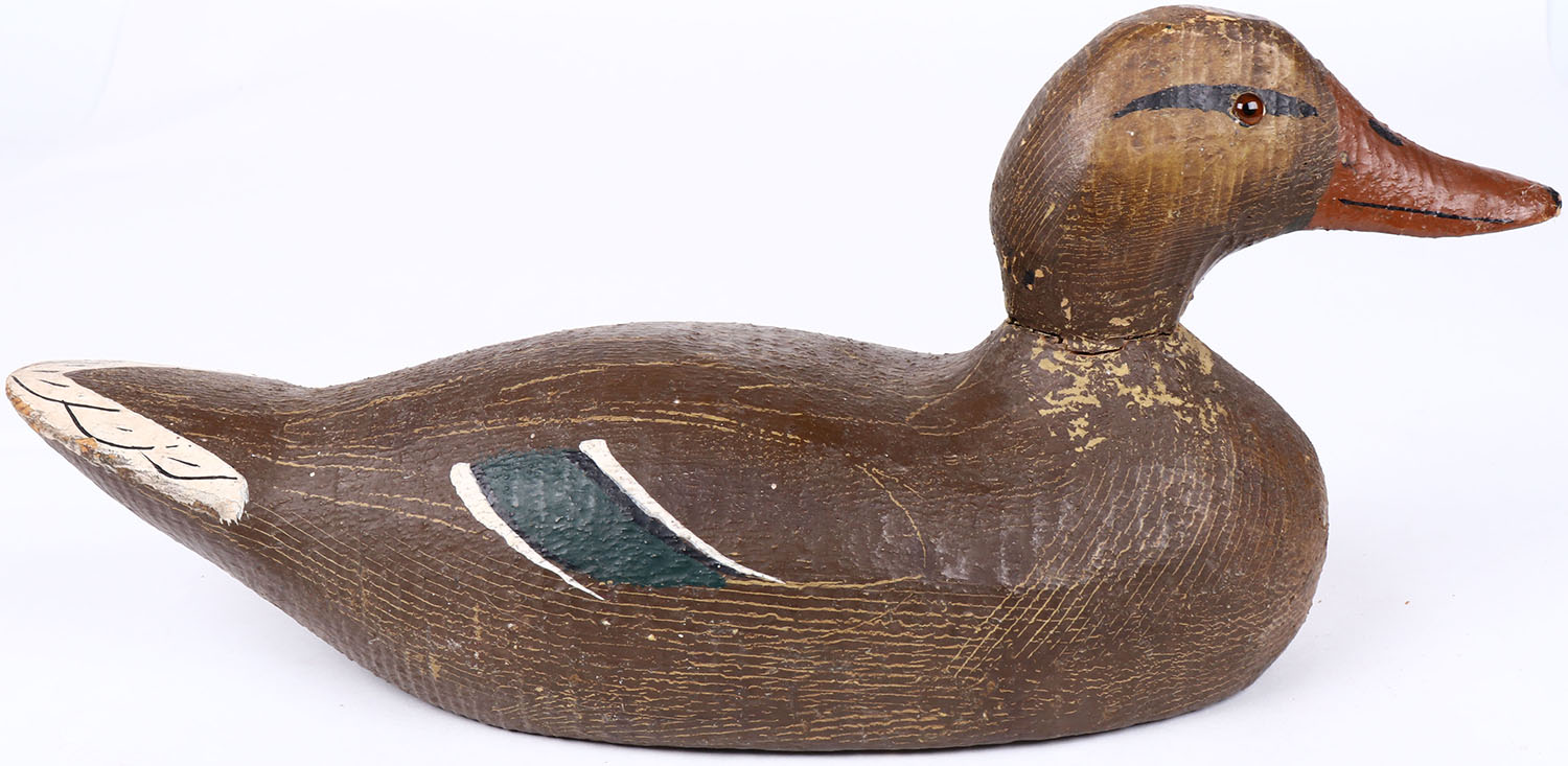 Mallard Hen by unknown factory, solid wood, glass eyes, original paint, structurally excellent. Grade: Excellent + - Value: 30 to 60