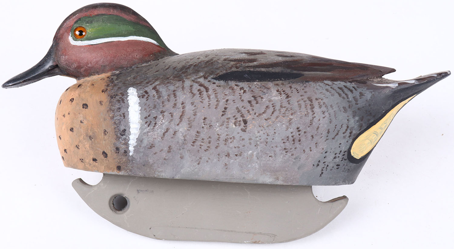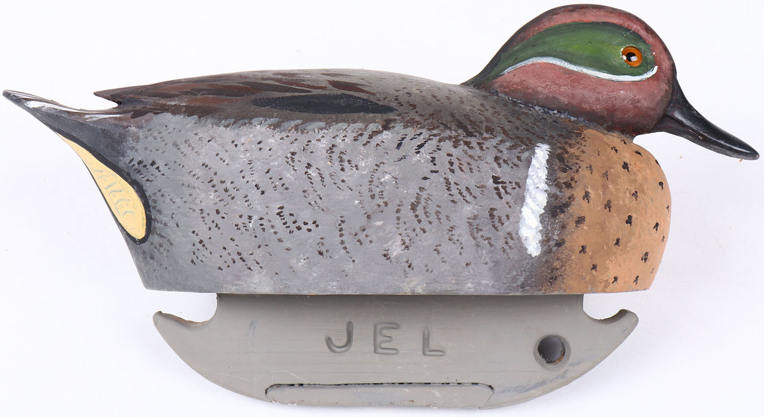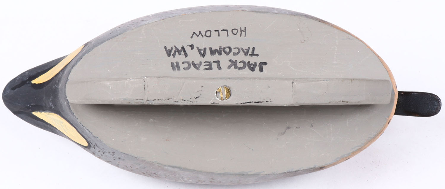 Green Wing Teal Drake by Jack Leach, Tacoma WA, glass eyes, hollow wood, original paint, structurally excellent, signed on bottom. Grade: Excellent + - Value: 70 to 150