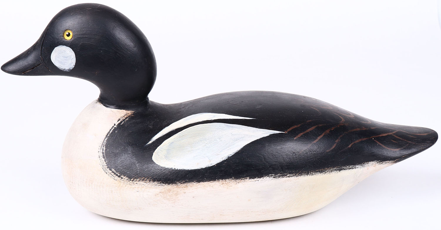 Goldeneye Drake by Mason Decoy Company, Detroit, MI,1896-1924 standard grade, glass eyes, solid wood, repainted, signed on bottom, structurally excellent. Grade: MINT - Value: 50 to 100