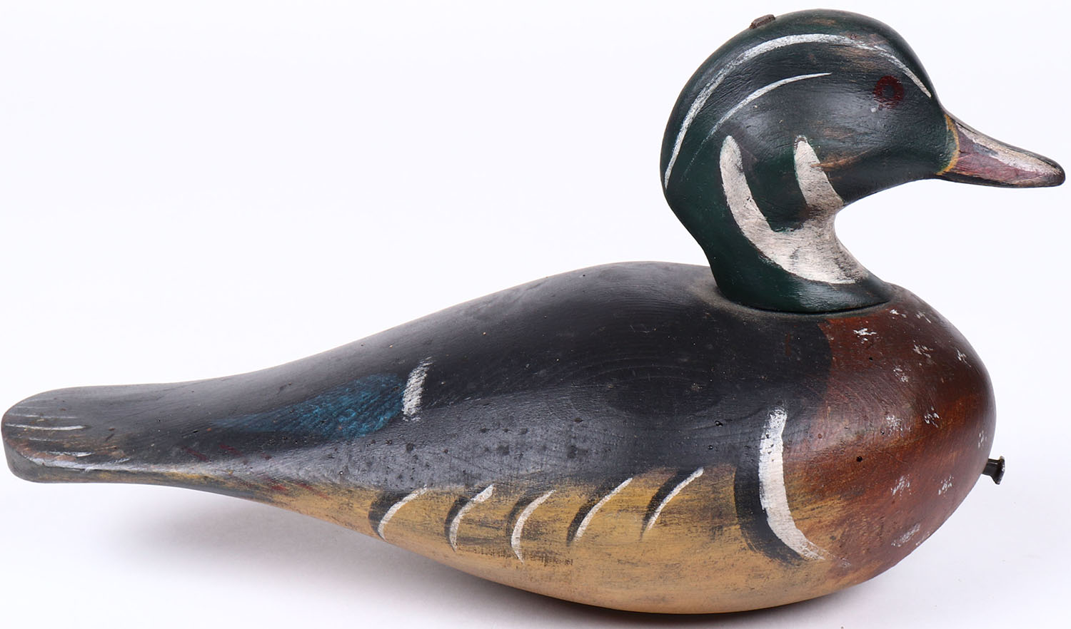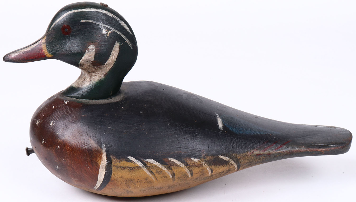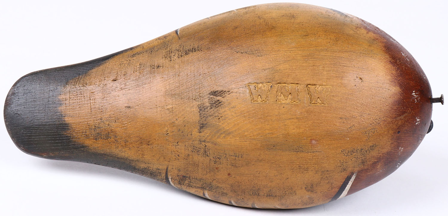 Woodduck by WMW, painted eyes, solid wood, original paint, structurally excellent, branded WMW on bottom. Grade: Excellent - Value: 30 to 60