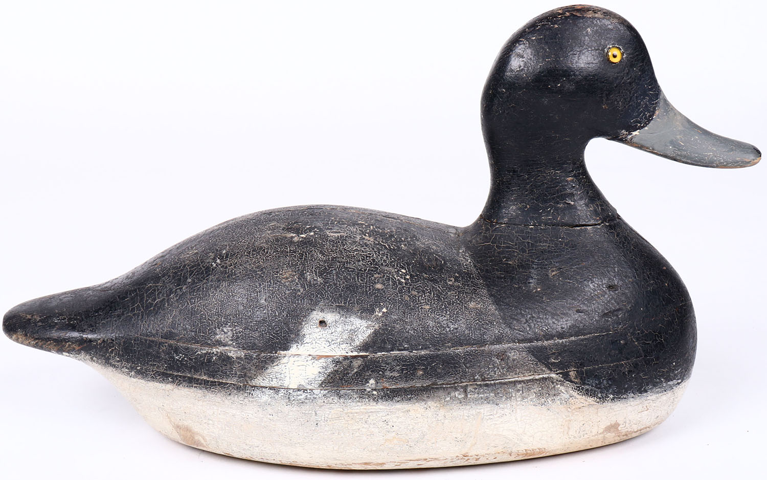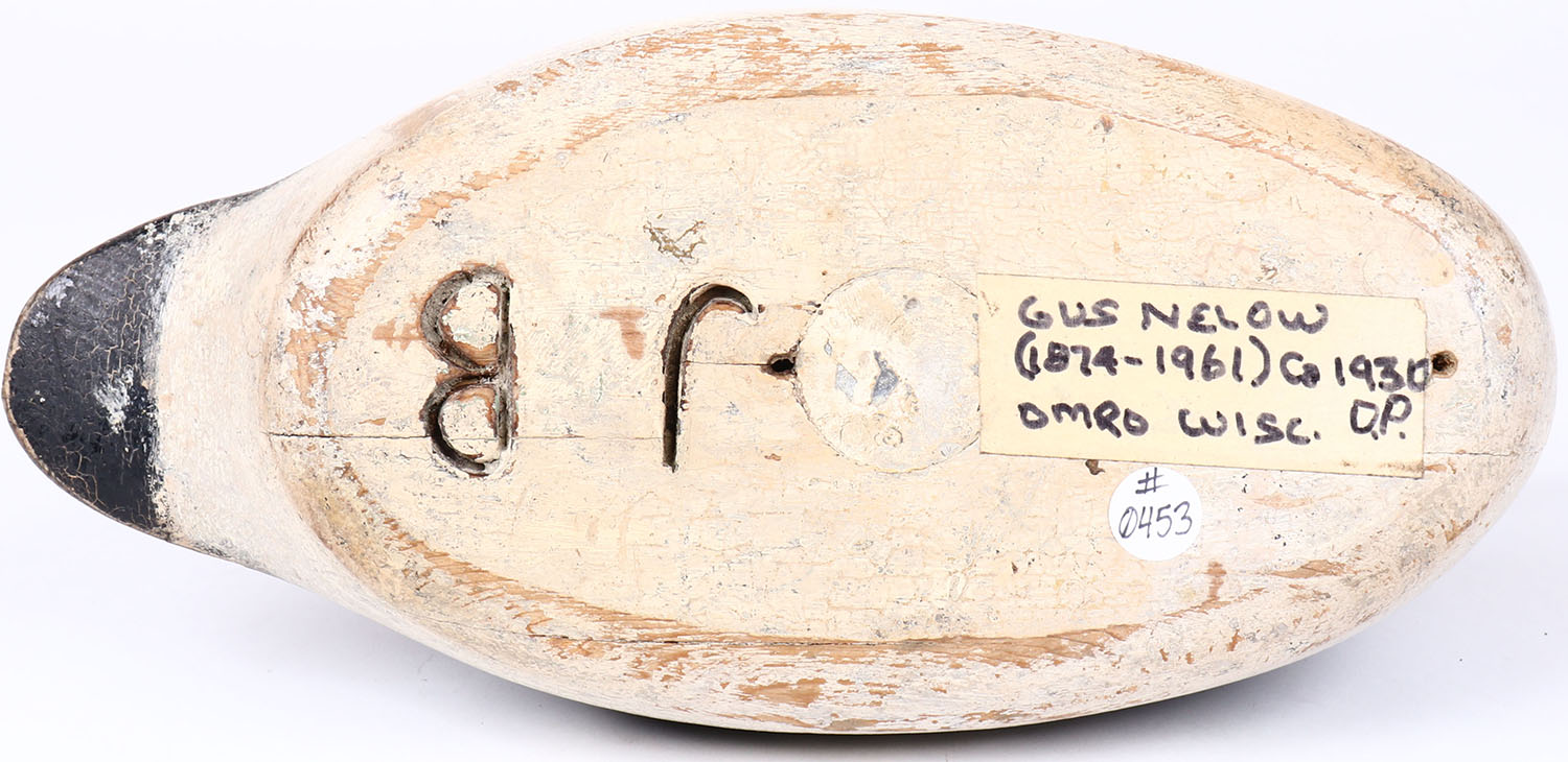 Bluebill Drake by Gus Nelow, Omro, Wisc, O.P. glass eyes, solid wood, original paint, branded JB on bottom, has hairline age crack on back. Grade: Excellent - Value: 100 to 200