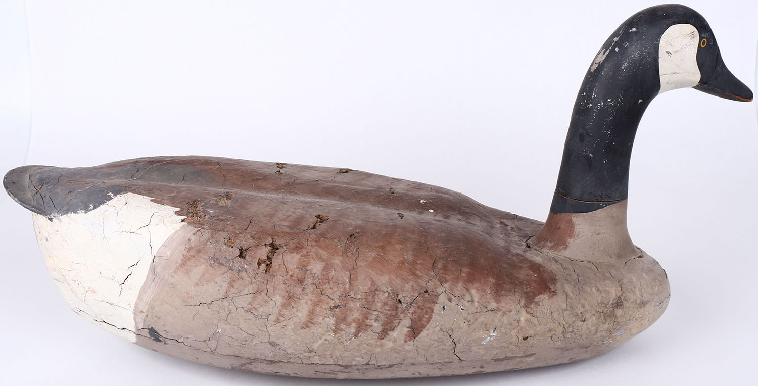 Canada Goose by R. Madison Mitchell Havre De Grace, MD. painted eyes, hollow wood, original paint with typical wear, has age cracks on body, signed on bottom. Grade: Excellent - Value: 60 to 150