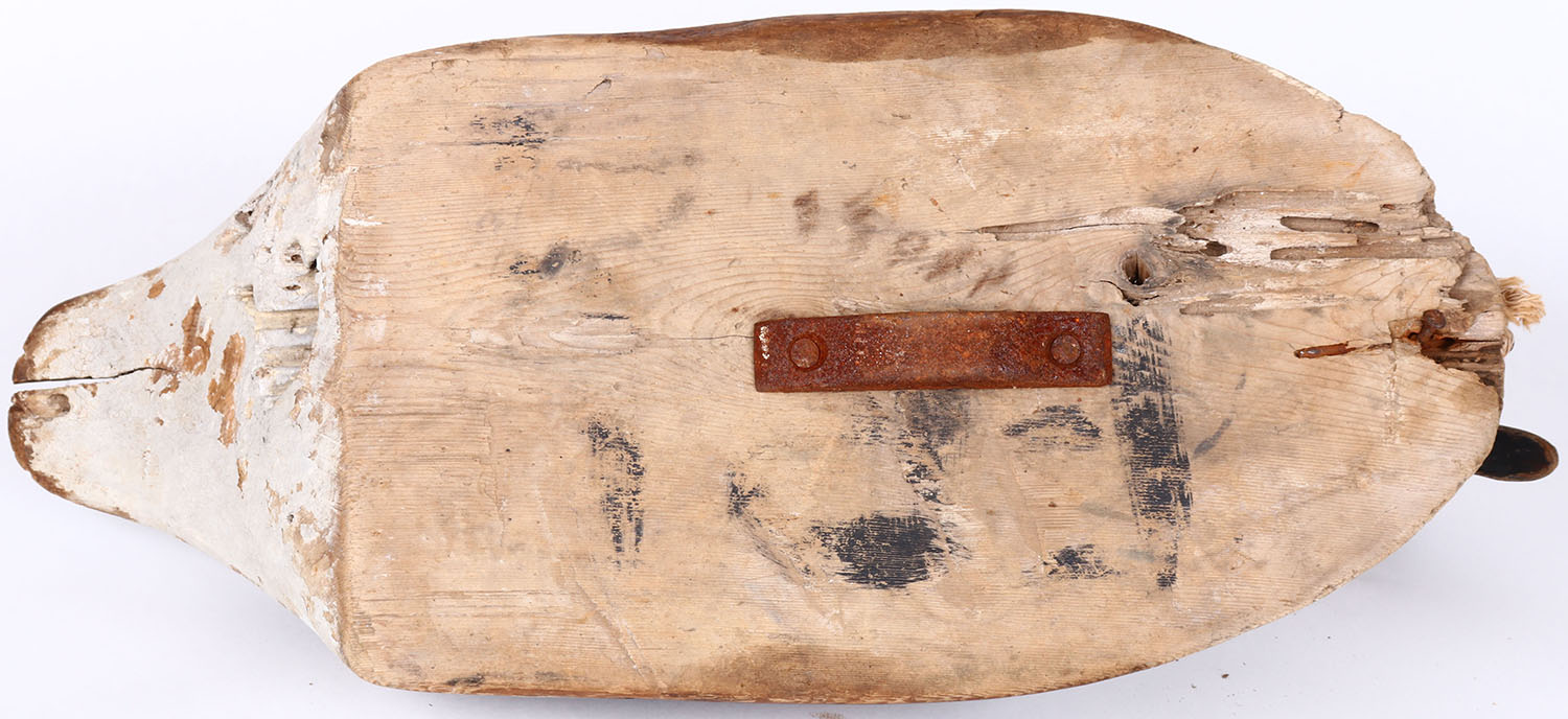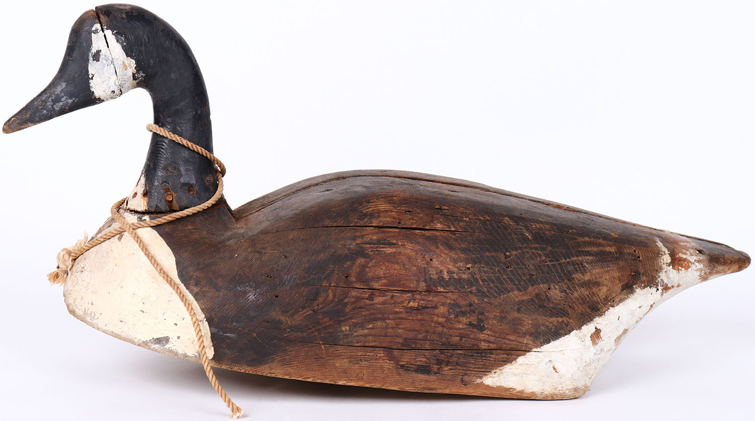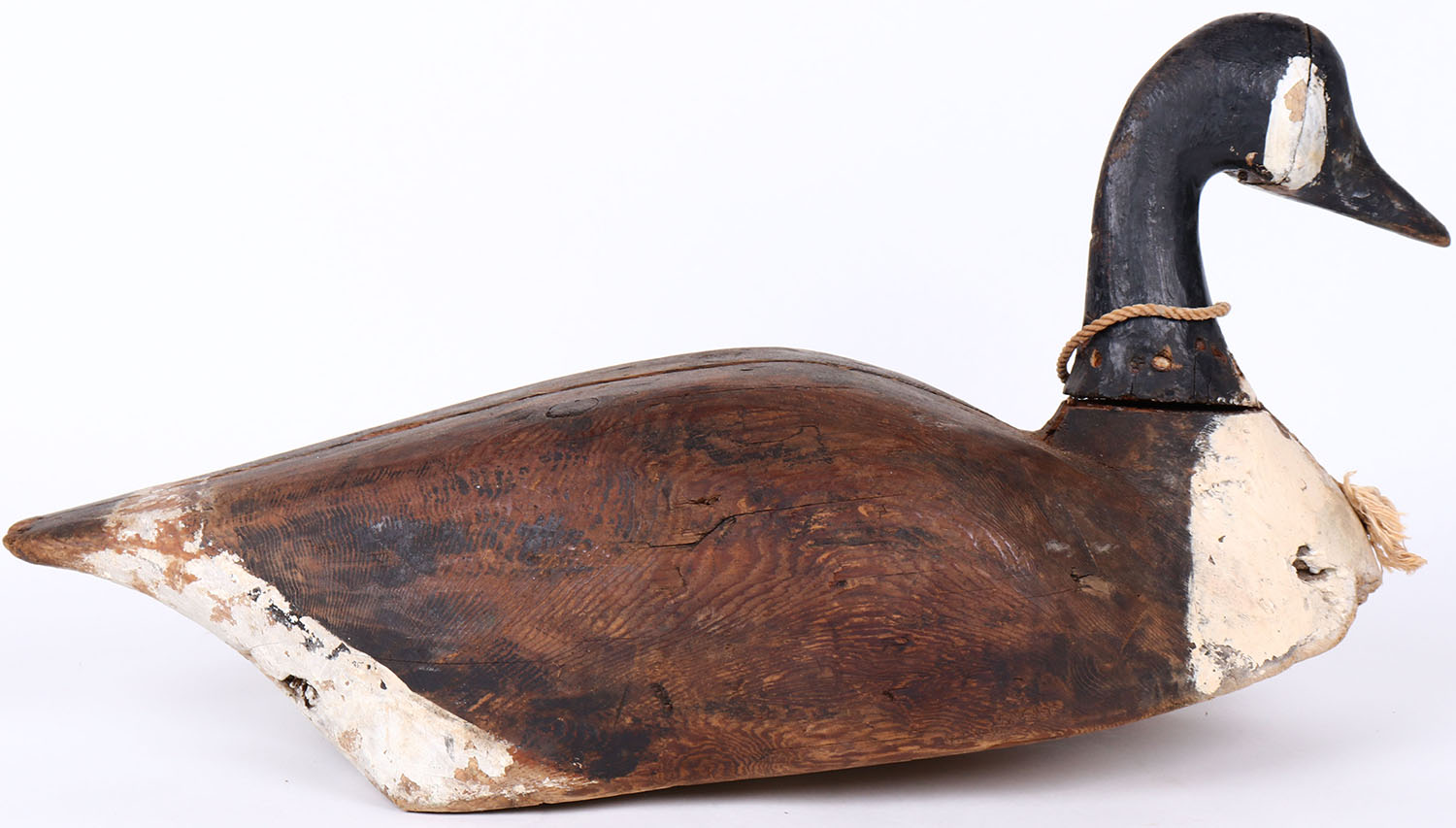 Canada Goose by unknown maker, painted eyes, solid wood, original paint, has age cracks on body and head. Grade: Very Good + - Value: 50 to 100