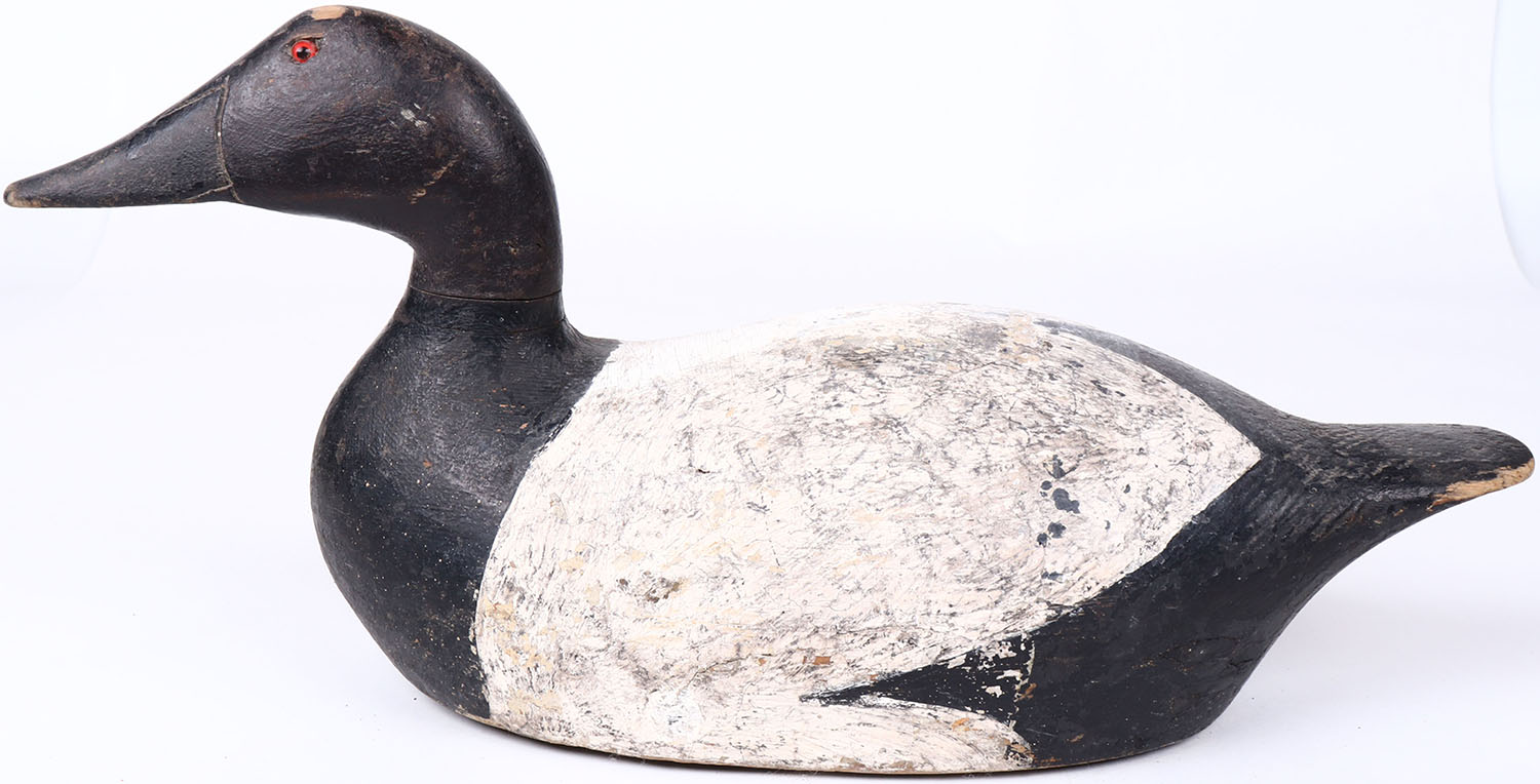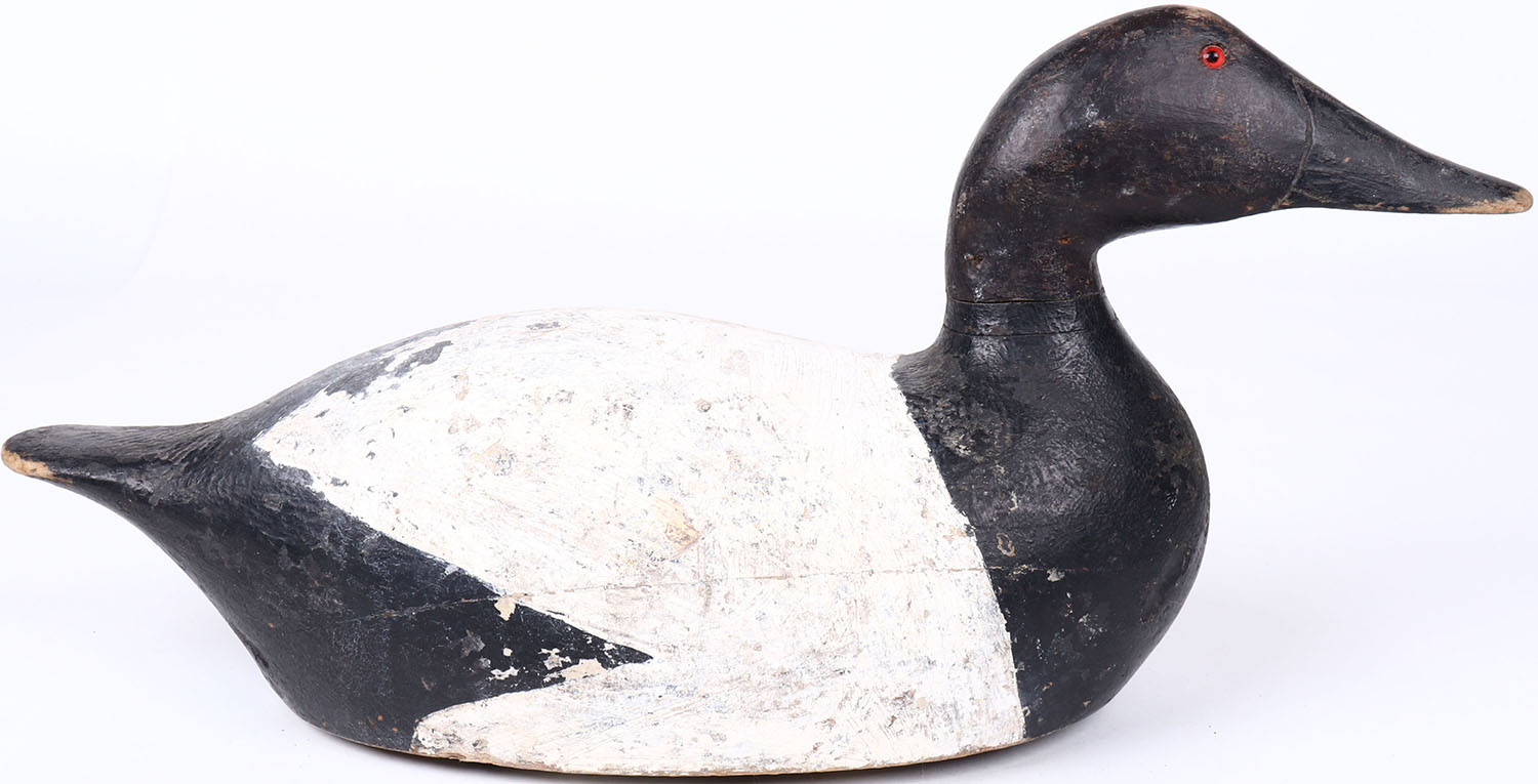 Canvasback Drake by unknown maker, glass eyes, solid wood, original paint, head is slightly loose. Grade: Excellent - Value: 50 to 100
