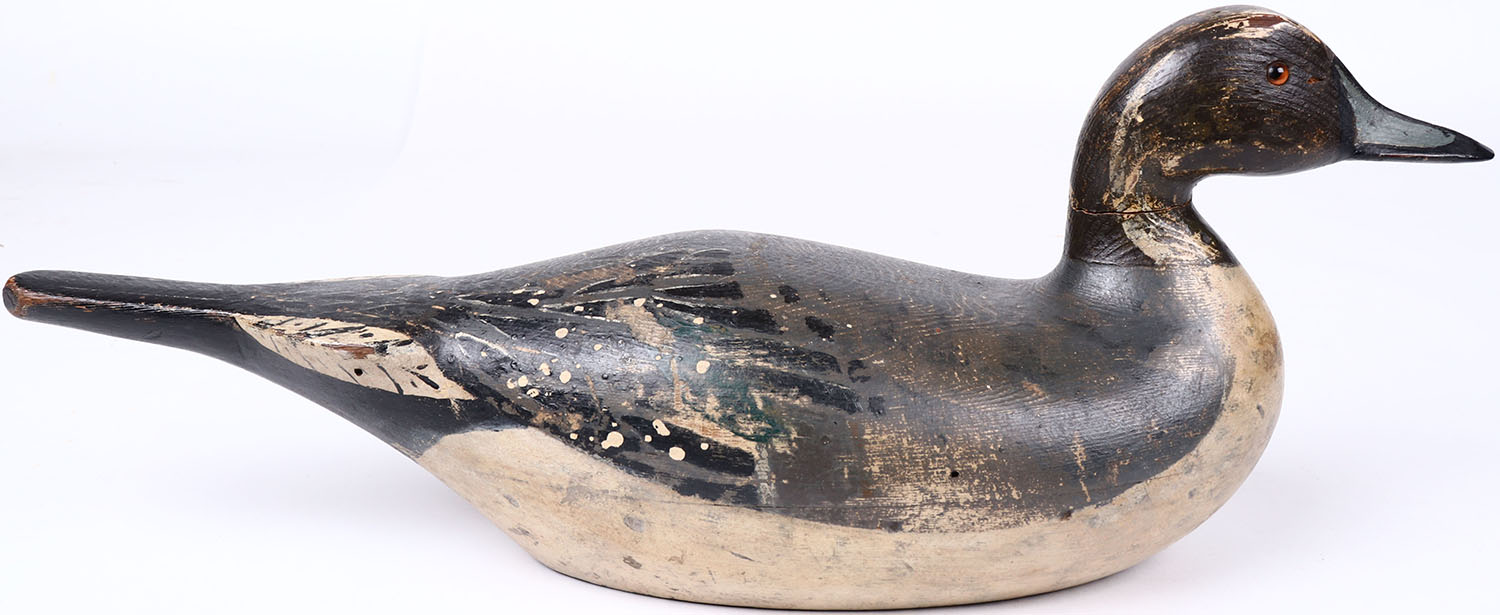 Pintail Drake by Charles Bergman, Astoria, OR, glass eyes, hollow wood, original Emil Hendrickson re-paint, neck is broken and comes completely off. Grade: Very Good ++ - Value: 500 to 1500