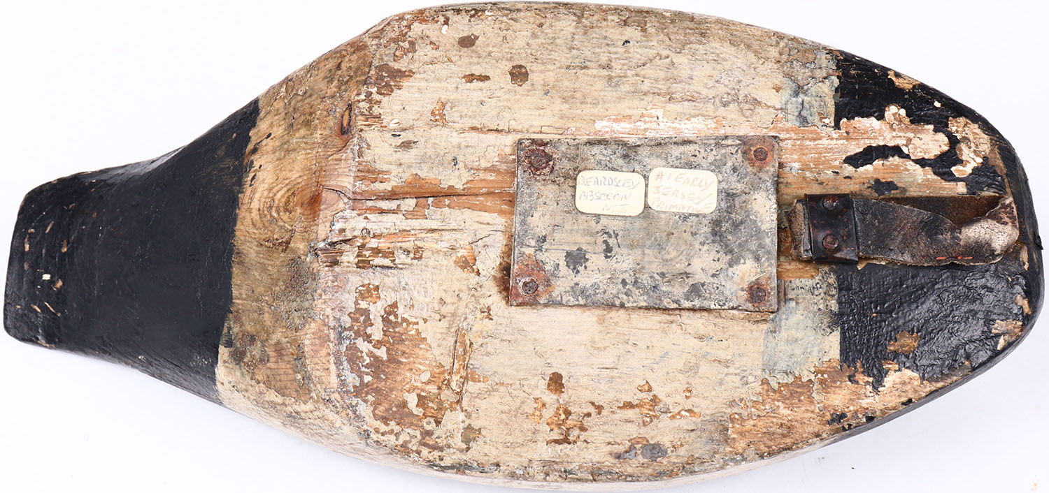 Bluebill Drake by unknown maker, NJ?, painted eyes, hollow wood, head is broken off from body, original paint. Grade: Very Good + - Value: 50 to 100