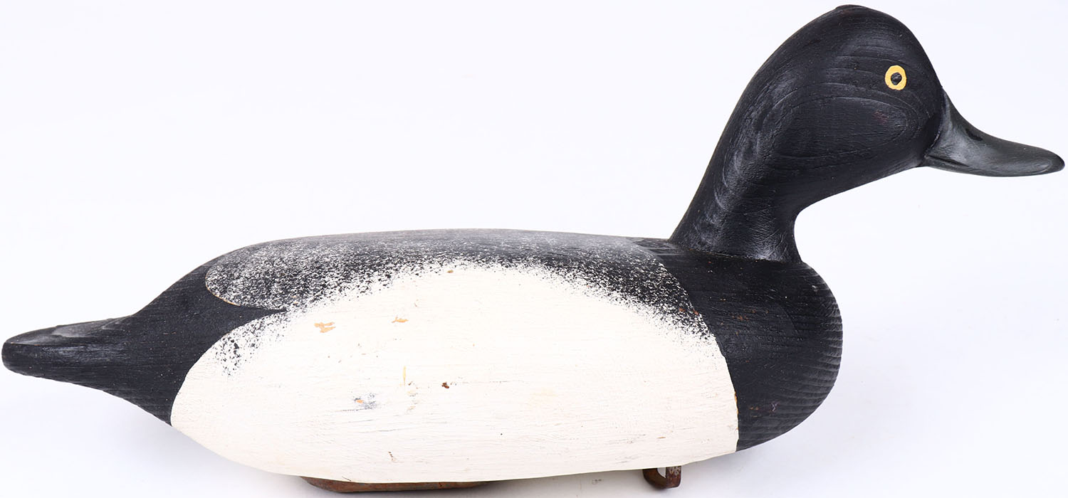 Bluebill Drake by JTB, painted eyes, solid wood, original paint, structurally excellent, branded JTB on bottom. Grade: MINT - Value: 30 to 60