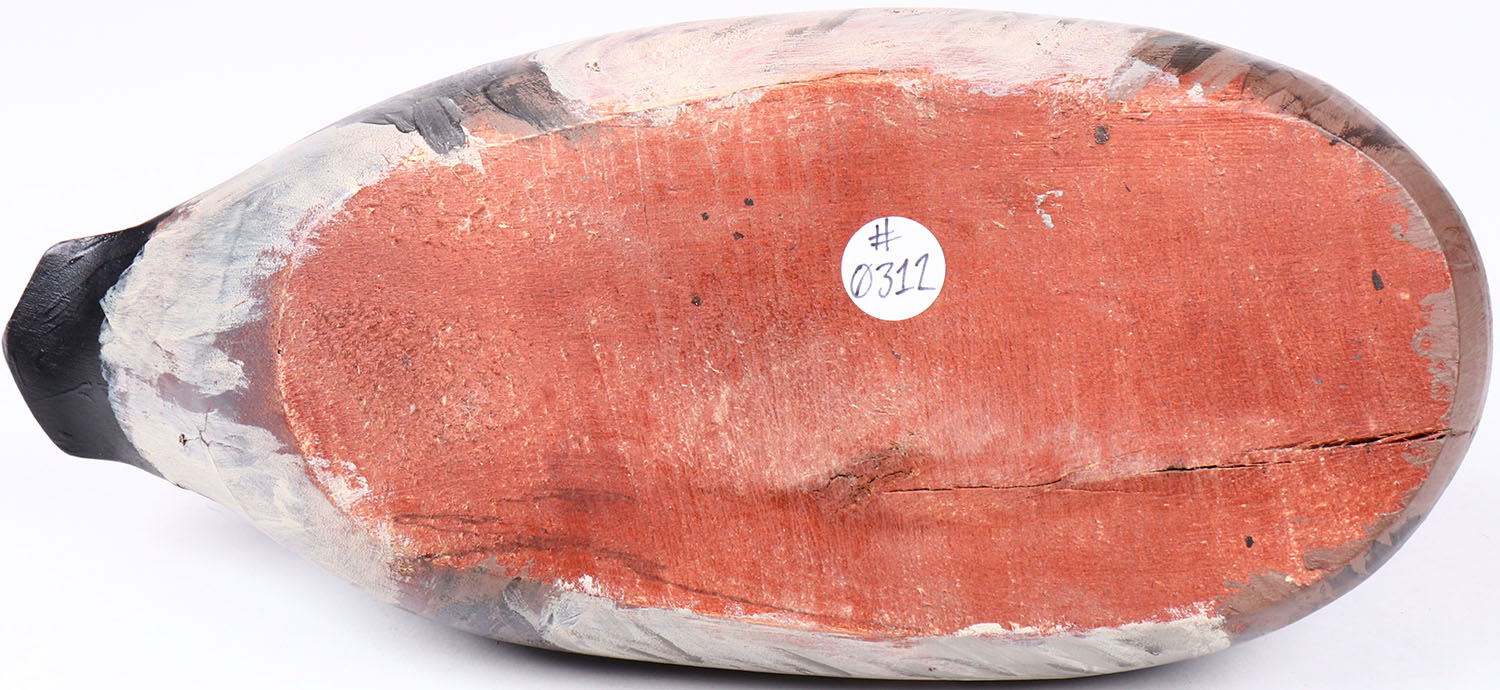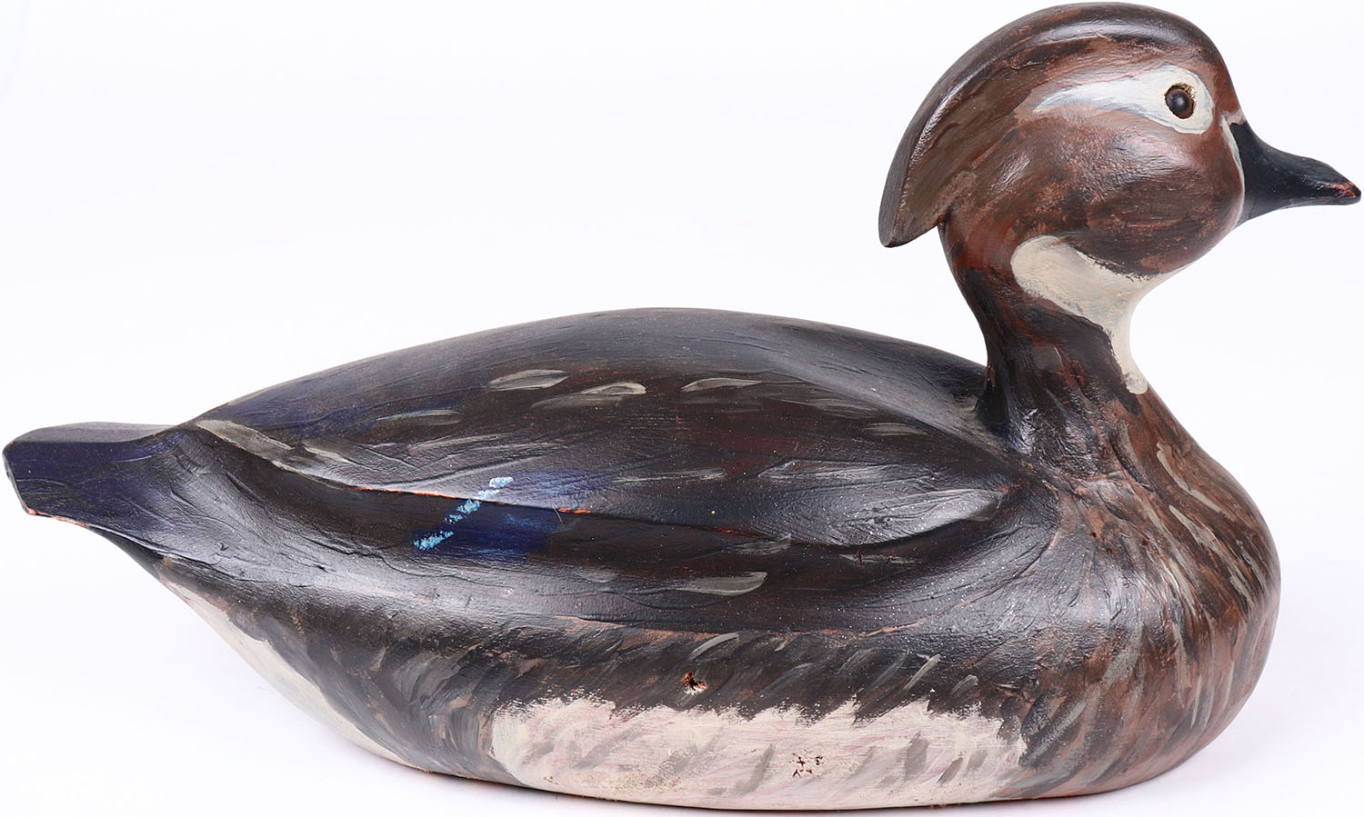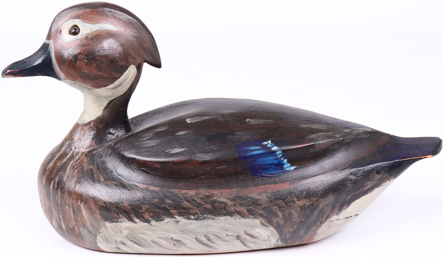 Wood Duck Hen by unknown maker, glass eyes, solid wood, repainted, structurally excellent. Grade: Excellent + - Value: 50 to 100