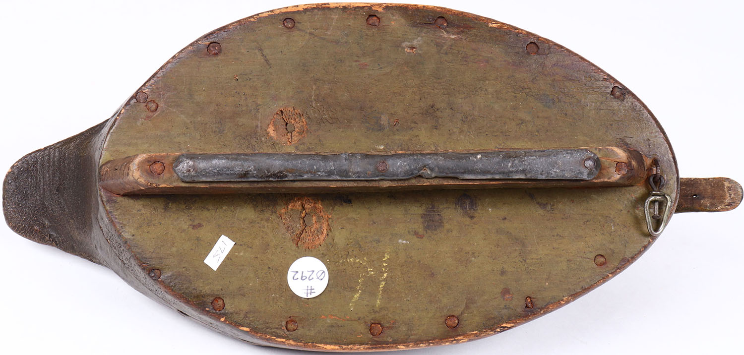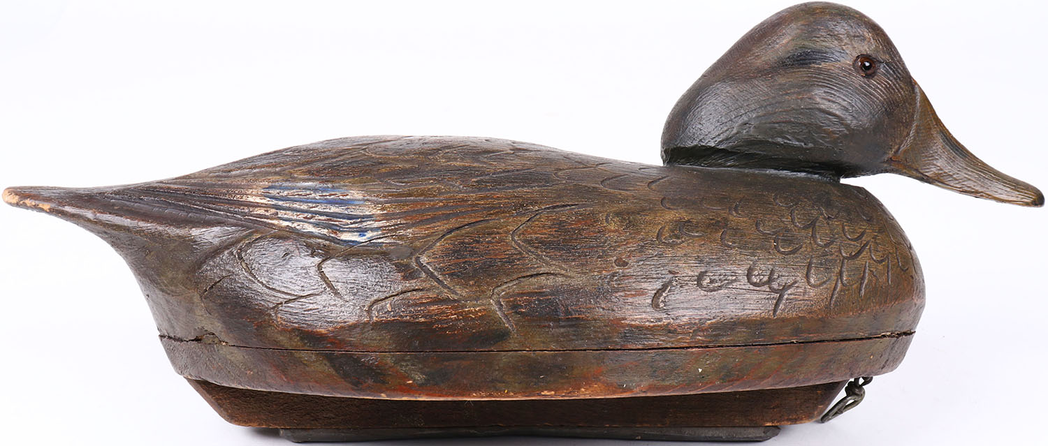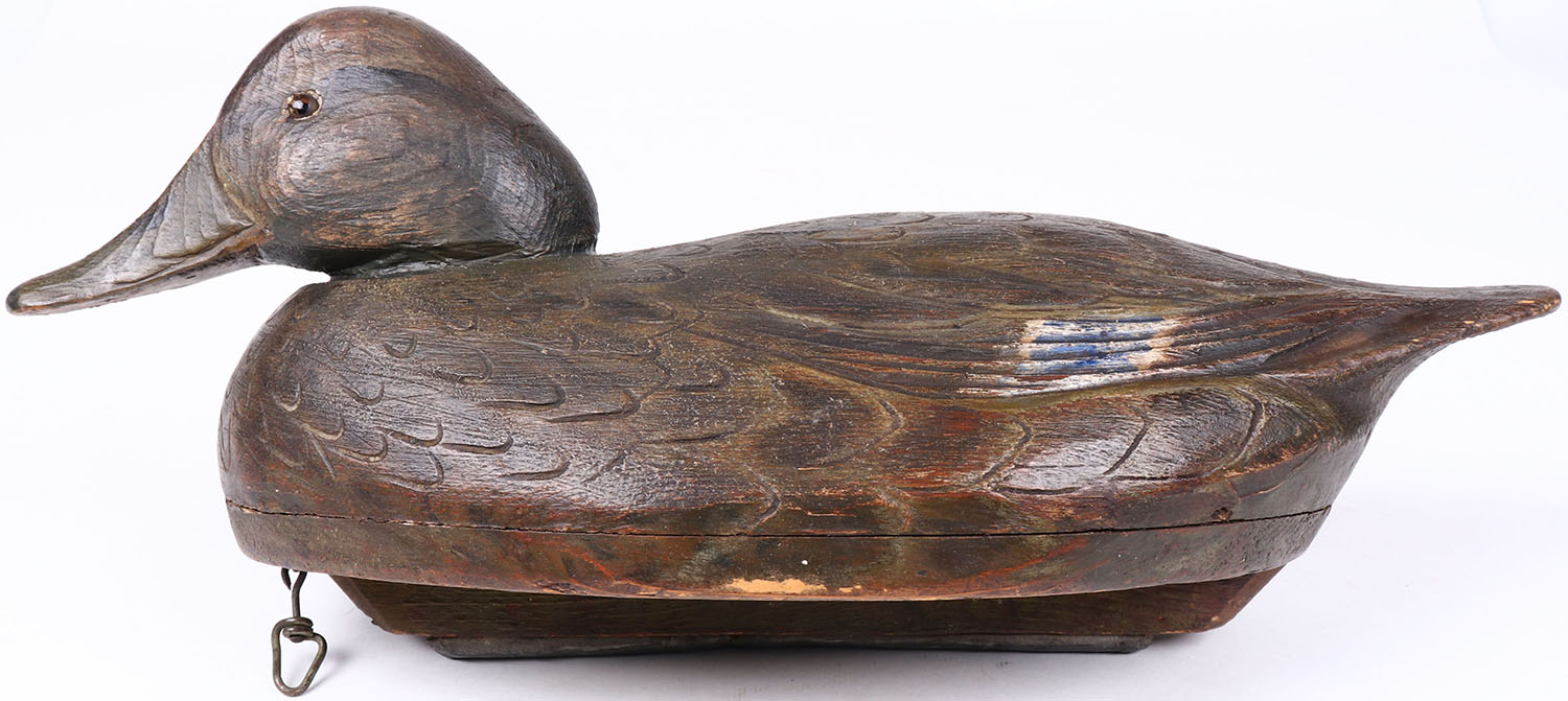 Black Duck by unknown maker, glass eyes, hollow wood, original paint, structurally excellent. Grade: Excellent + - Value: 50 to 100