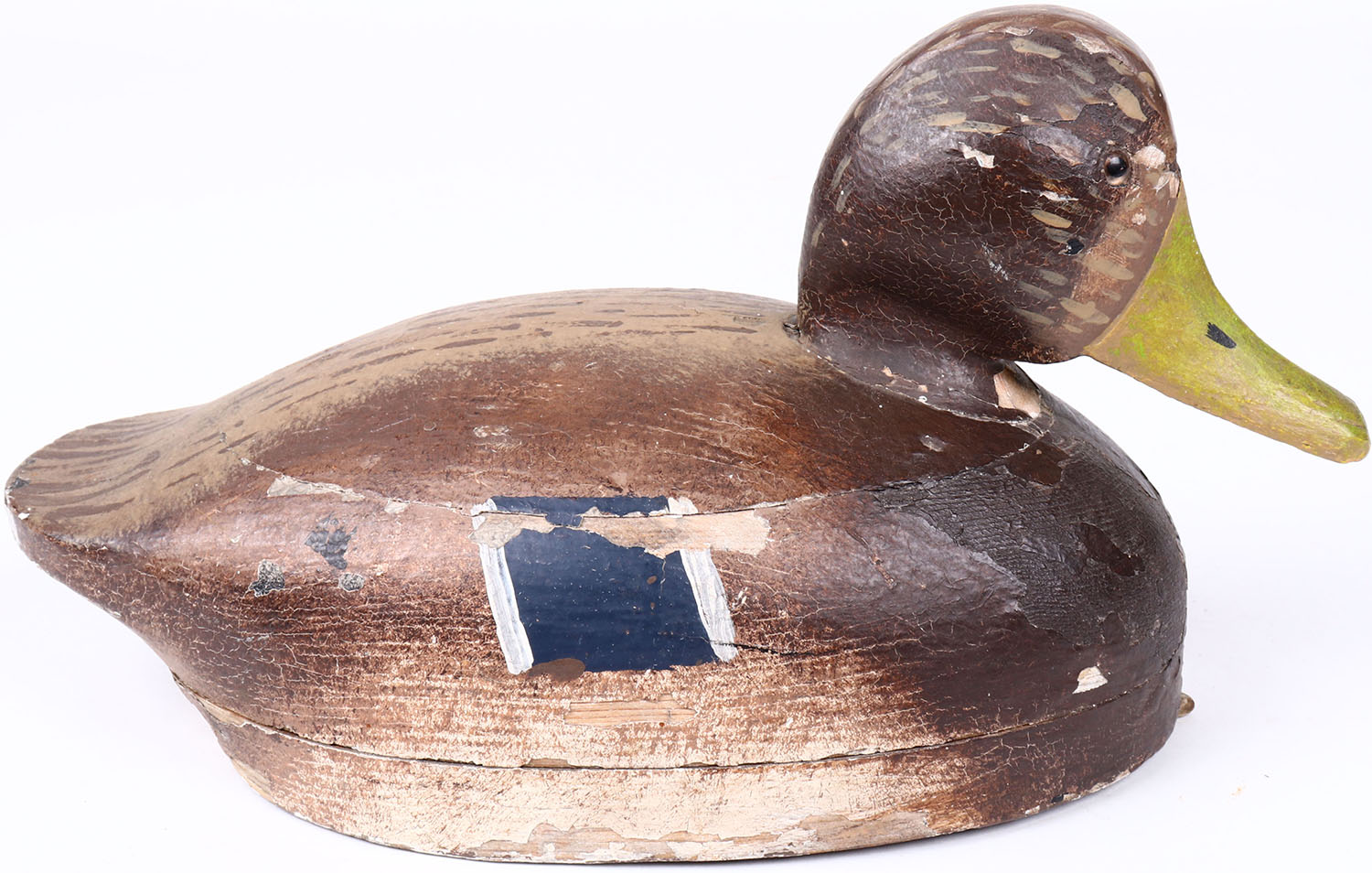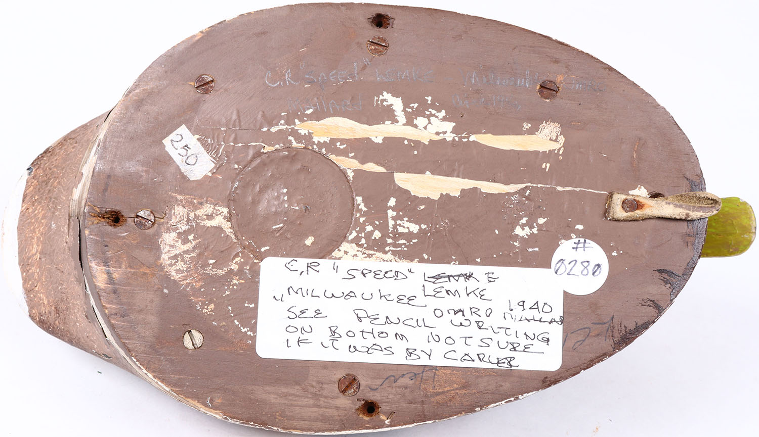 Mallard Hen by C.R. Lemke, Milwaukee, Omro, glass eyes, hollow wood, original paint, structurally excellent, signed on bottom. Grade: Excellent + - Value: 50 to 100